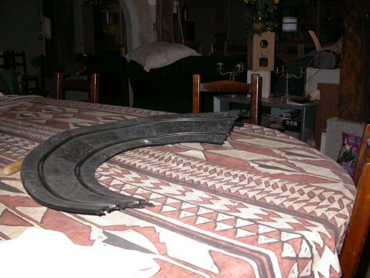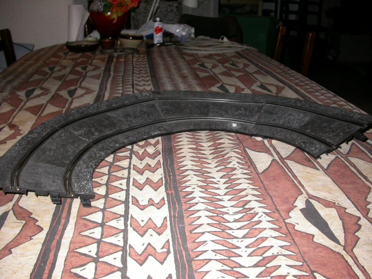 une fois en place sur le circuit la courbe ne présente plus les petits défauts aux raccords de rails et on a un virage relevé ninco