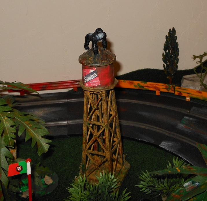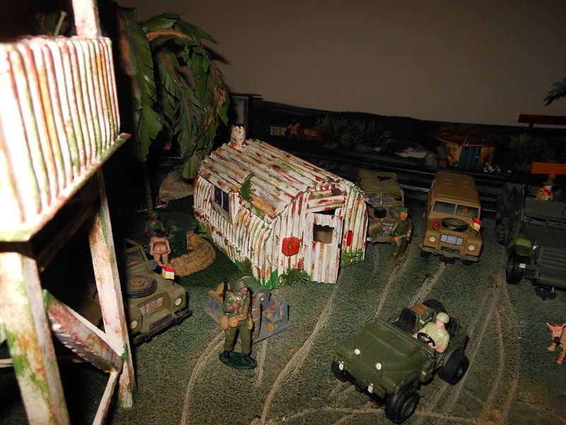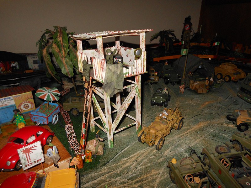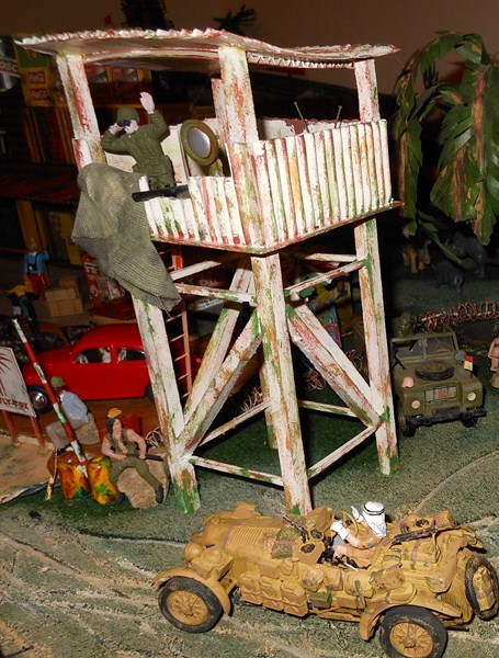 La baraque Nissen est faite avec une chute de gouttière plastique habillée de carton ondulé et le mirador avec des chutes de baguettes de bois, un bout de calendrier et du carton ondulé, le filet de camouflage avec un sachet de thé en tissus, seule l' échelle provient d' une maquette.
