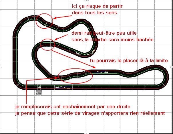D'accord avec Elnomad à propos des demi-rails après un virage et avant l’aiguillage. Comme lui je pense qu'une pitlane aurait toute sa place sur ton tracé et le rendrait encore plus réaliste.
