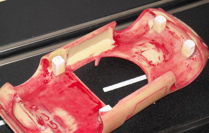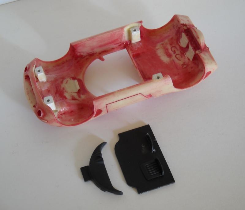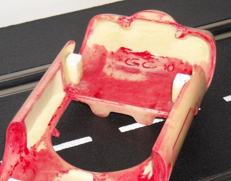 On commence par le bidouillage de l'intérieur de la carrosserie pour pouvoir y adapter le châssis FLY, à savoir collage de nouveaux puits de vis faits maison et ablation des anciens ; plus une partie du nouvel habitacle :