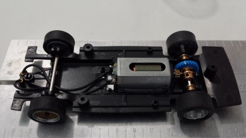 Donc, j'en ai profité pour changer les pneus (Slot-It N22, pour changer des Paul Gage), les jantes, la couronne (vis foirée sur l'axe d'origine, décidément!) pour une plus petite, les paliers (trop "libres" d'origine") et l'axe arrière...