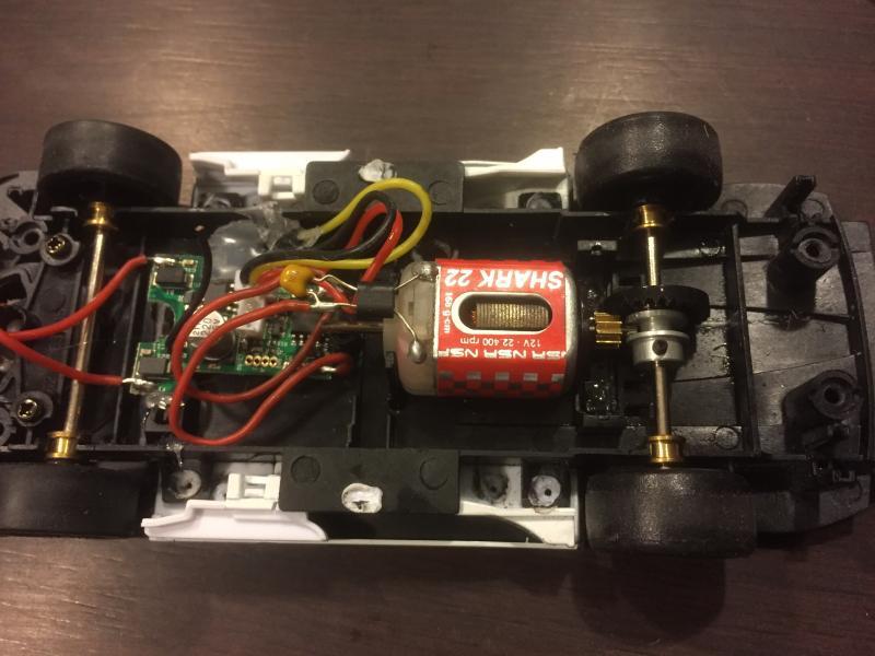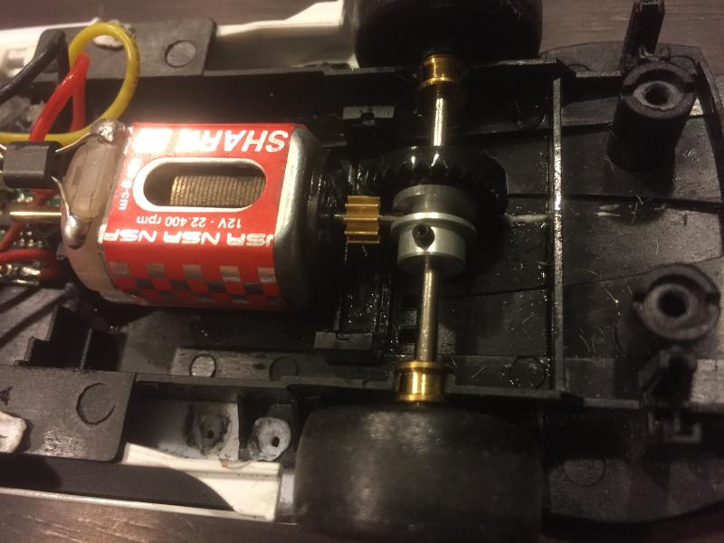 j'ai viré tout le système de guide carrera (il était trop long et bloquait dans les courbes) et j'ai mis un simple guide qui normalement va sur les NSR, apparemment ça convient, on verra à la longue. J'ai changé le moteur pour un moteur NSR