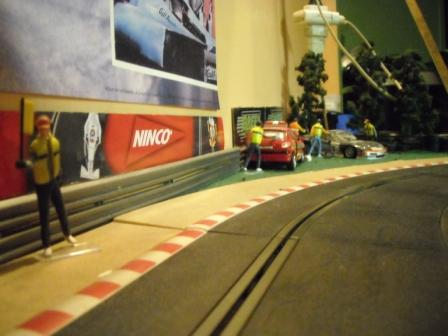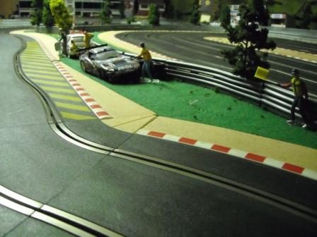Nous avons découpé les bordures scalex afin de les éloigner du bord de la piste et nous avons ajouté de la moquette verte de 5 mm d'épaisseur, le rendu est pas mal.