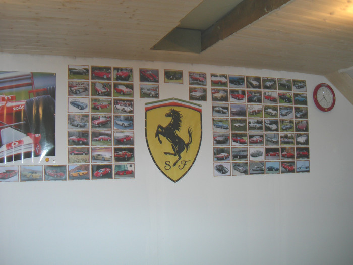 Moi de Ferrari je n'ai que le drapeau (avec le damier qui part en pointe pour laissé place au sublime sigle au cheval cabré!!) que l'on m'a ramené du grand prix de monaco et j'ai une petite perle que je fais écouter a tout mes amis....le réveil Ferrari avec projection au plafond de l'heure et du sigle Ferrari! Et bien entendu la sonnerie de réveil n'est autre que le bruit de la F1 enregistré a Silverstone!!!