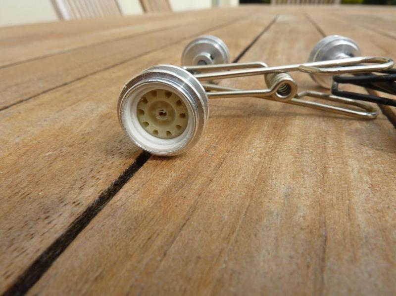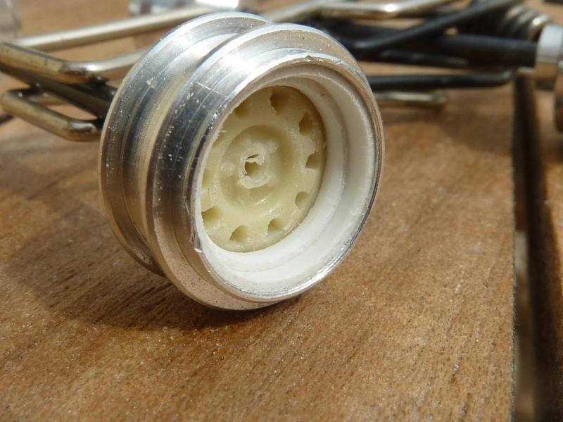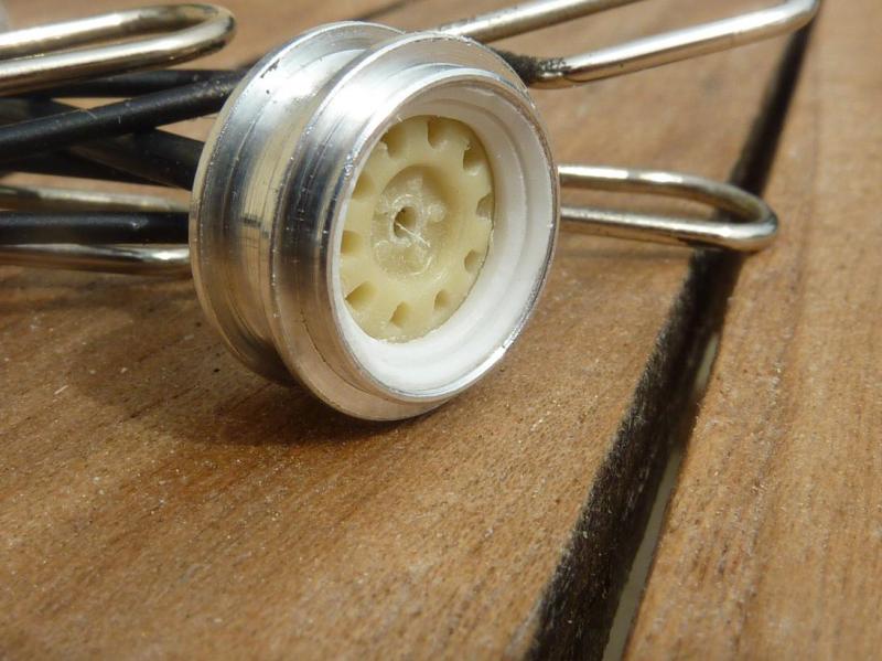 pour cette dino, changement de technique,au lieu des jantes de 17 racer avec flasques,cette fois ci,j'ai utilisé des jantes de 16 avec les memes insert que j'ai réduit en diamètre puis en coupant des rondelles dans du tube evergreen,j'ai reconstitué les cerclages et voici ce que ça donne