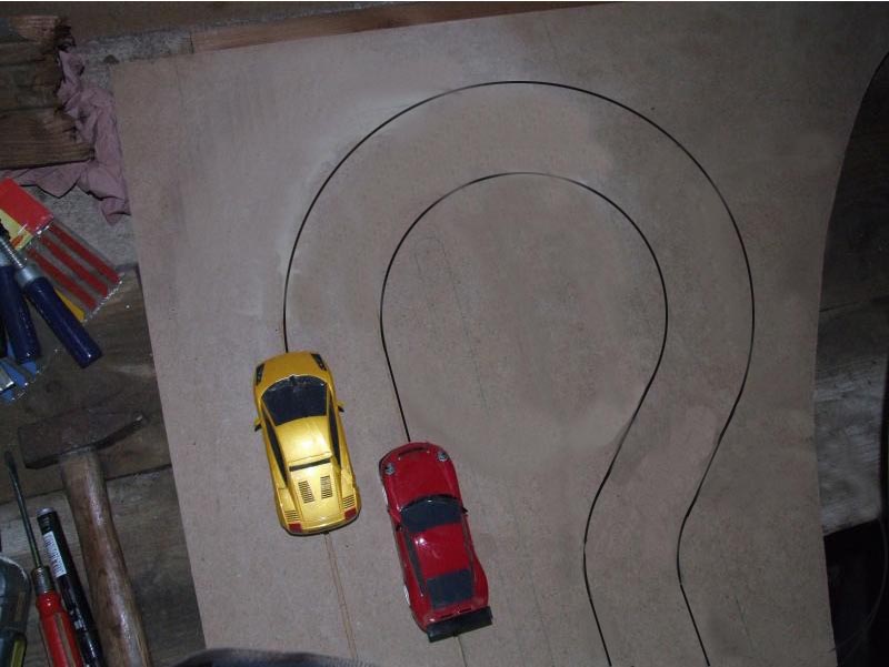 Il te suffit ensuite, ou bien de faire un aiguillage orientable ou prévoir une simple cale que tu peux placer à la main ou retirer qui oblige l'auto à bifurquer.