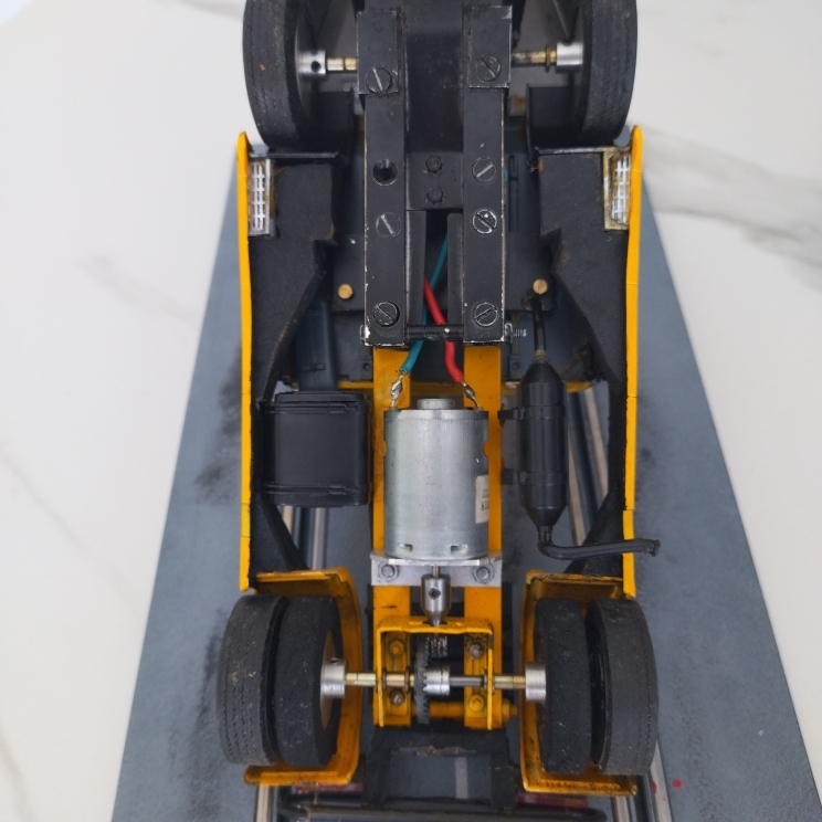 Fait de profils en aluminium carré assemblés par vissage. Un moteur trouvé à l'époque chez Casto et une transmission de 1/24 la plus grande couronne que j'avais