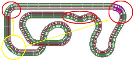 A mon avis tu devrais, selon le sens de rotation, modifier une des courbes en bout de la longue ligne droite (en rouge) par une courbe plus ouverte (en jaune). L'idée de la chicane avant ou après le pont ne me semble pas idéalement placée. D'une manière ou d'une autre, que tu rentres dans le virage à la sortie de cette portion ou que tu sortes de cette courbe avant de l'aborder, tu partiras dans tous les sens et tu risqueras le déslotage et la sortie de route. J'espère que c'est clair pour toi parce qu'en me relisant j'ai pas bien compris