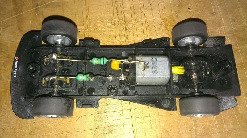 Pour en revenir à mon sujet, après 3 jours de rigolades, et quelques sorties de route, la dernière fut fatale à l'Audi Red Bull du Carrera Go (1/43) puisque la résistance entre le moteur et la tresse s'est cassée à la base de la résistance.