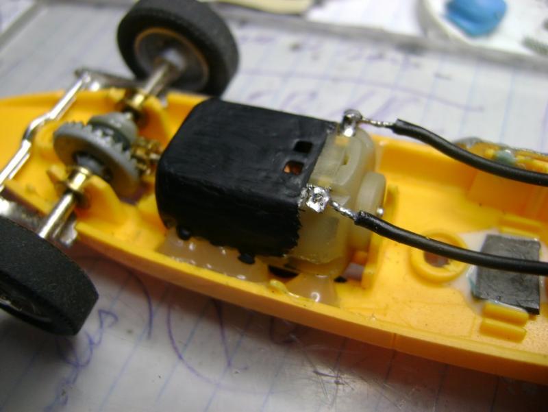 Pour l'habitacle il faut gratter en dessous du pilote et j'ai repeint le moteur en noir et avec une piste Ninco ou autres bitume noir, l'effet d'optique ne paraîtra presque pas.