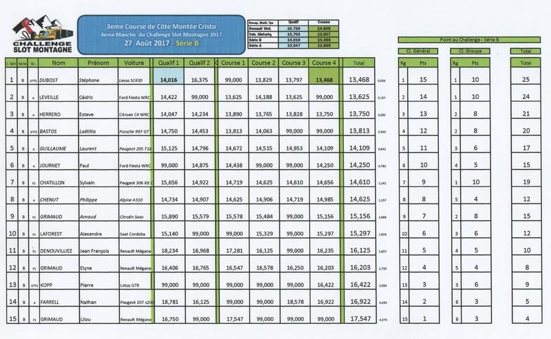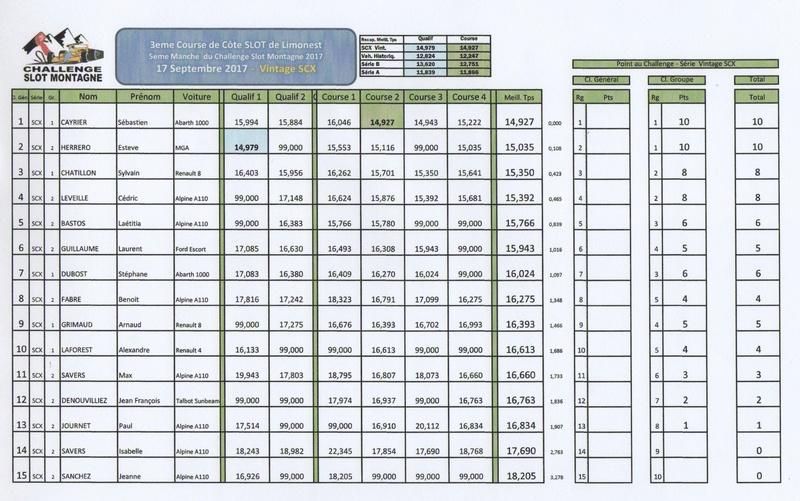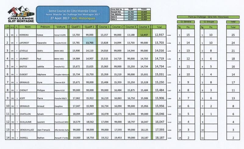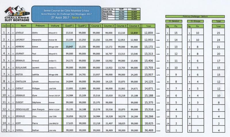 Je passe le micro à Arnaud, l'organisateur et responsable de la manifestation: "Bonjour à tous les amis. Pour la quatrième manche du Challenge Slot Montagne 2017, la Montée Cristo de a attiré 14 autos pour la série réservée aux autos ‘Vintage SCX’. Plusieurs ‘arrivants’ sont venus découvrir la joie du ‘Slot’ sur ce tracé fabuleux au décor à nul autre pareil : les clermontois du Club des Gaulois venaient découvrir la discipline face aux habitués et aux locaux". Parlons maintenant des qualifs : On enregistre beaucoup de sorties de route dès le début des hostilités. Le parcours a été repeint et on appréhende assez mal le fort grip. De fait, ce seront trois locaux qui signeront les trois meilleurs temps des manches qualificatives : Cédric Léveillé (Alpine A110 – 15″750) devant Philippe Chenut (Alpine A110 – 15″937) et Paul Journet (Alpine A110 – 16″078). Arnaud Grimaud (Renault 8) signe le 4eme temps de la série et le meilleur du groupe 1 (16″390). C’est serré derrière entre Alexandre Laforest (Renault 4 – 16″891), Elyne Grimaud (Alpine A110 – 17″016) ou Stéphane Dubost (Abarth 1000 – 17″063) voilà pour cette catégorie vintage.