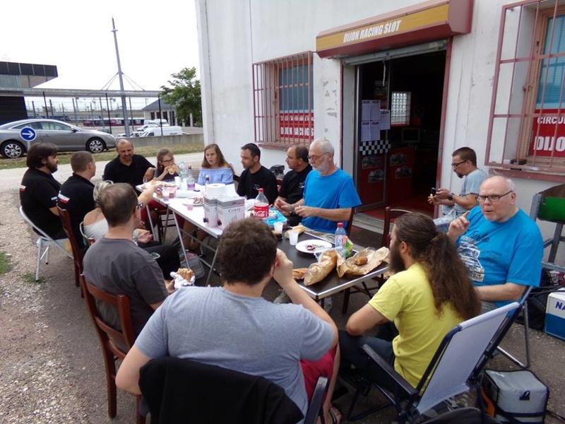 Le Dimanche après les essais qualificatifs du matin....les repas sont pris dehors en toute convivialité avec tout ce qu'il faut pour passer un bon moment de bonheur. En prime, le taulier nous en a sorti une bonne en déballant le Saint Nectaire ... "Tiens, on dirait une maquette"....