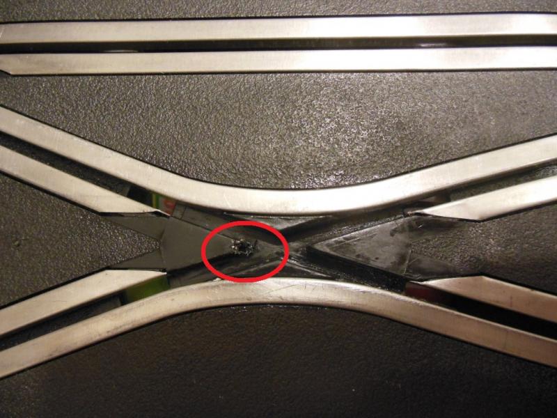 Une de mes changements de voie Scalex est endommagé au droit de la pointe en plastique située juste en aval du croisement. Sans doute des impacts de guide qui auront eu raison de cette pointe au fil du temps?!?