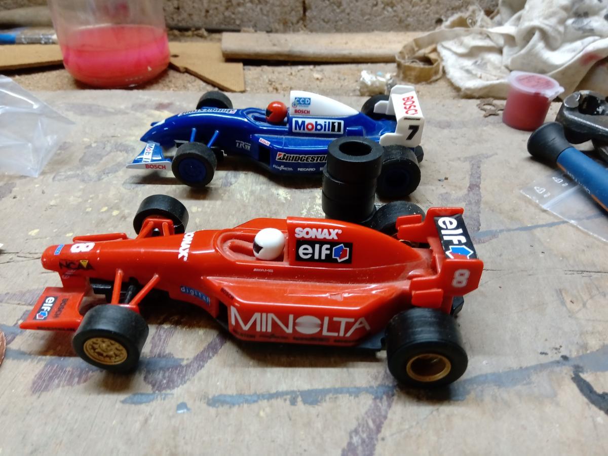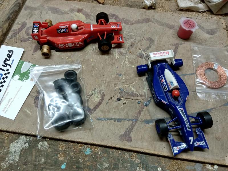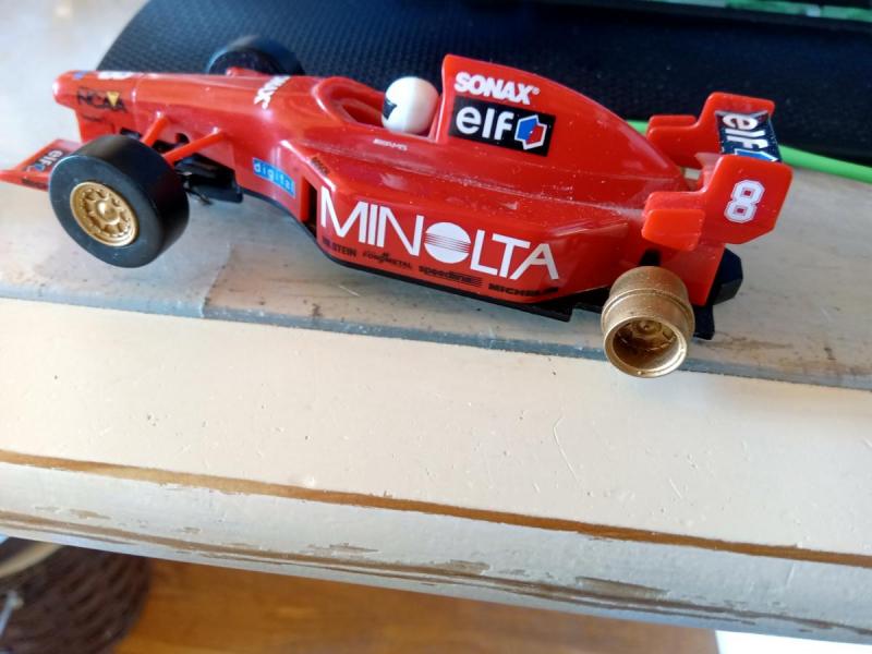plusieurs jours que je parcours le web et les vendeurs de pièce de slot pour trouver des pneus de rechange pour cette F1(pneu d'origine bien lisse vieillissant et qui en plus accroche plus à la jante) :
