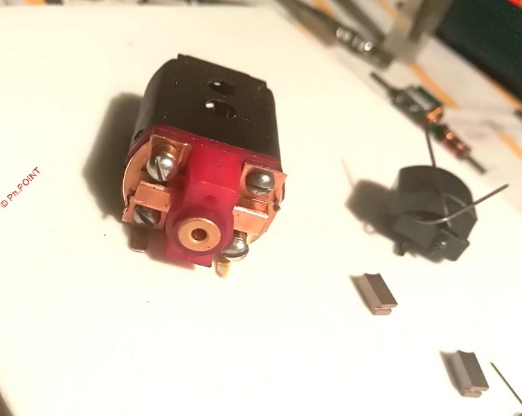 Et pour terminer je soude sur le dessus de chaque porte-charbon un petit shunt fait dans un fil ultra souple dont l'autre extrémité est appuyée par la petite patte du ressort contre le charbon :