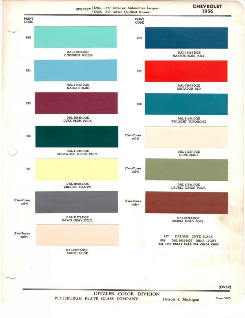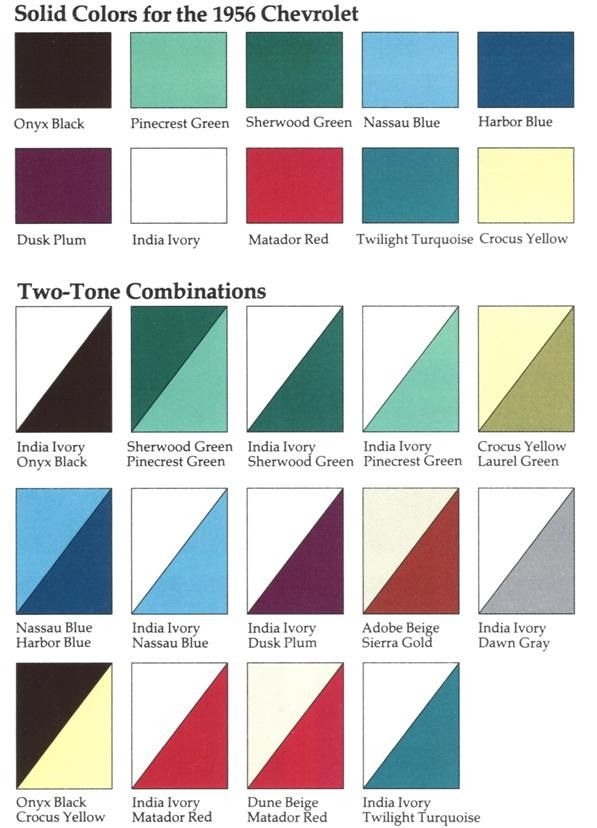 Un autre membre explique que sa Chevy 55 est Pine crest Green métallisée, mais qu'il existe aussi le Sierra Gold, l'Inca Silver , les Shadow Grey et Neptune Green ; auxquels viennent s'ajouter les Sherwood Green et Harbour Blue en 1956.