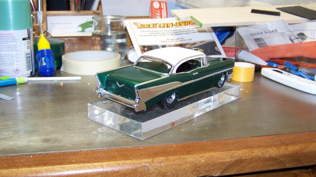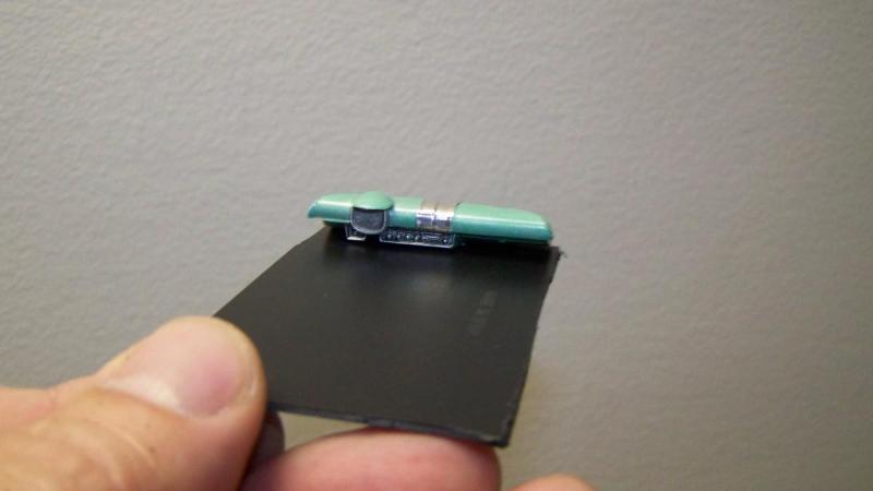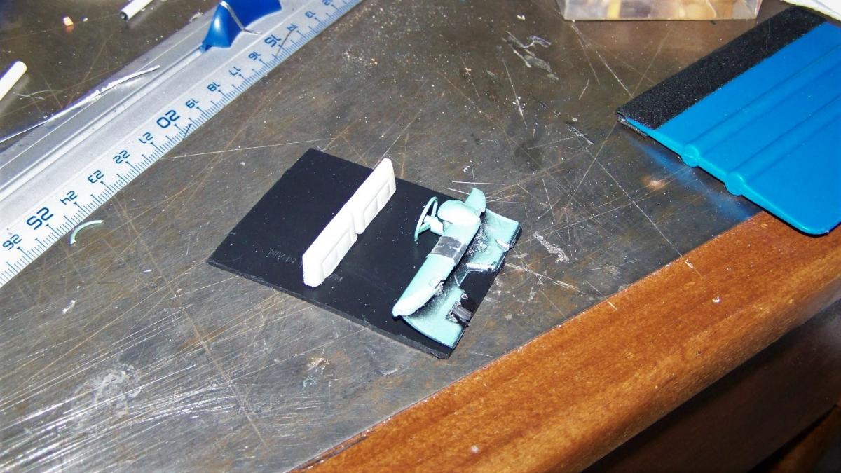 Les travaux continus, avec les aménagements intérieurs, et tout d'abord, le tableau de bord taillé dans la cheminée du destroyer, j'ai ajouter le dessous du tableau de bord de la Continetal, peint en vert clair métallise, et rajouté un peu de chrome au milieu pour fair plus sixties. on colle le tout sur un plaque plastique découpée dans un fond de boite Ninco.