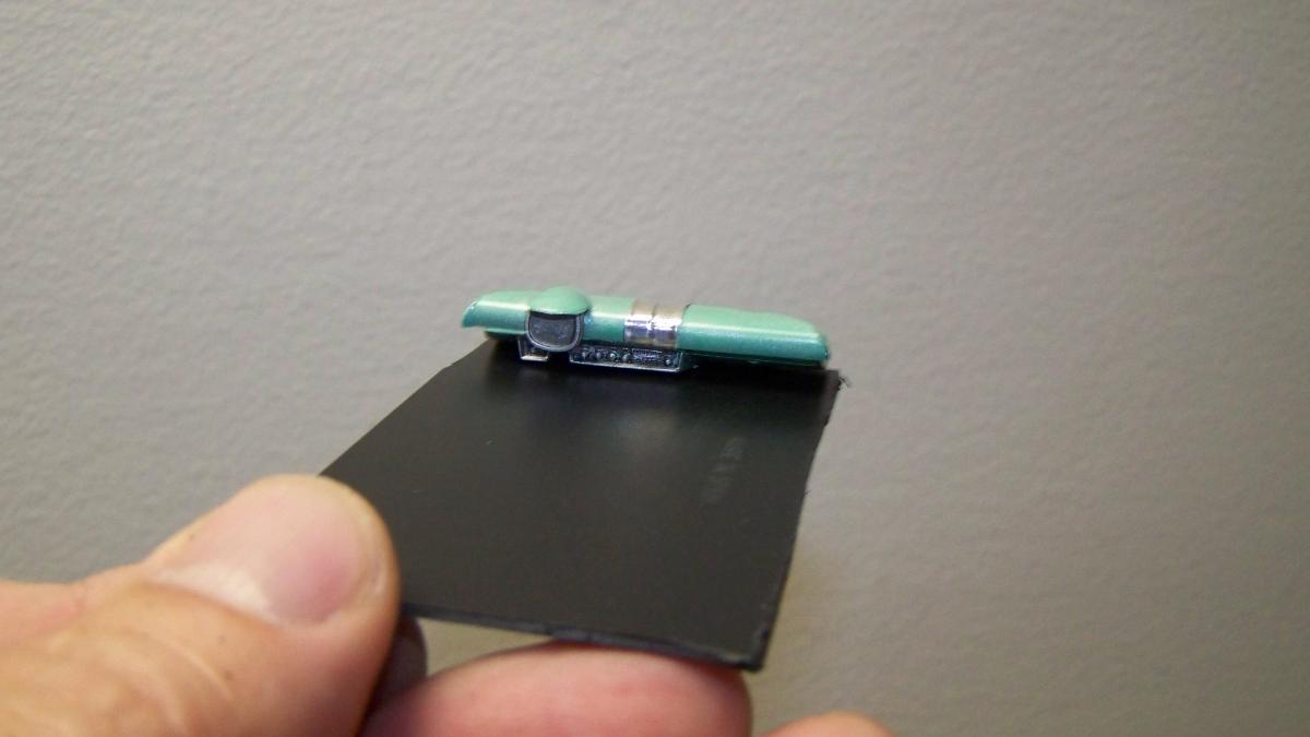 La plage arrière en balsa, couverte d'un apprêt et peinte dans la même couleur que les sieges, est collée à la banquette arrière puis ajoutée au reste. Le tout est monté dans l'auto et collé à la colle chaude.