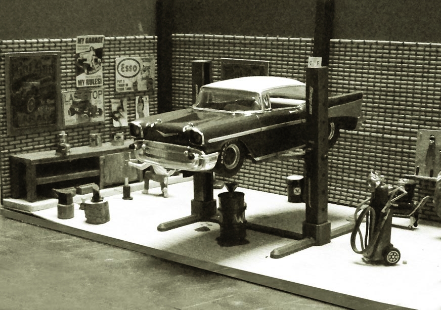 Sur ce cliché, on m’aperçoit de dos à genou devant l'établi. Les filles ne bossent pas le week end, elles font des course de dragster ou de hot rod et boivent des coups avec des gros durs.