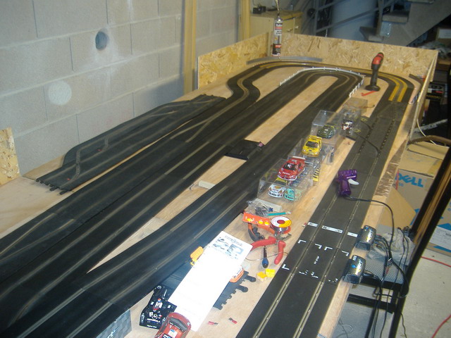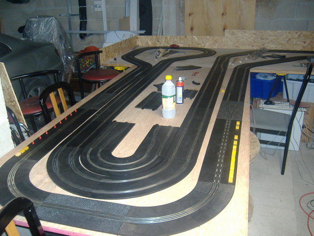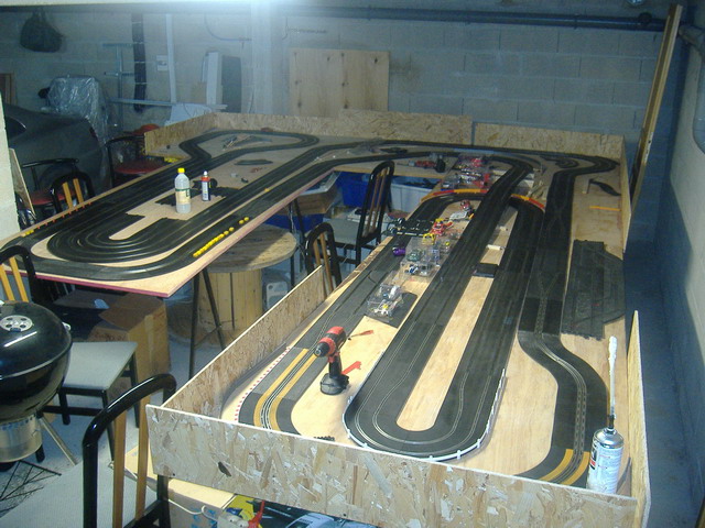 A la recherche depuis pas mal de temps pour choisir mon tracé, je me suis enfin decidé pour pouvoir m'amuser cet hiver. Il fait environ 34 metres en scalex sport et classic mais je pense que je vais le modifier car je trouve mes lignes droites pas assez longues. En plus ma femme qui travail de caisserie emballage bois m 'a ramenée encore une planche de 2,80 x 1,20, si ca continu soit les voitures vont coucher dehors ou il va falloir déménager.