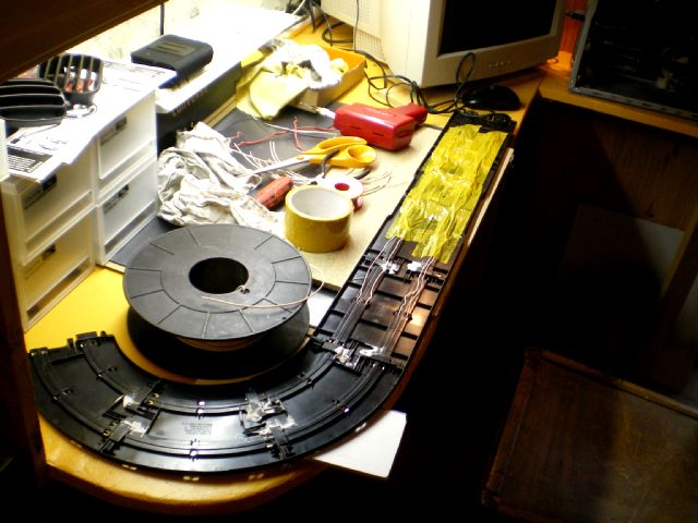 en fait j ai tout repris depuis le début....les rails que javais faite dans le bois avec les contacts me plaisait pas.... mauvais roulage et les voitures étaient très aléatoire comme comportement...