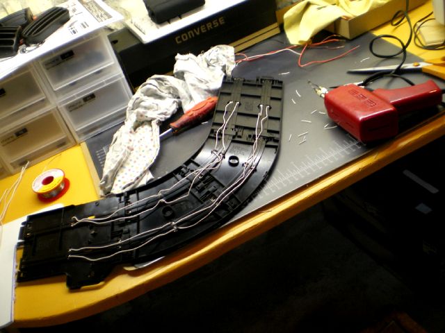 pour éviter les surprises, les baisses d alim et touts ces truc que les slotteurs naiment pas..jai ponté toute les railles.. meme les carréra neuves... le must quoi..3 jour de taff mais quel bonheur..je conseil de faire ca si vous envisagé de faire une déco ensuite... c est réellement du tous bon.. mais le fer a souder a chauffé.;c'est vrai ..