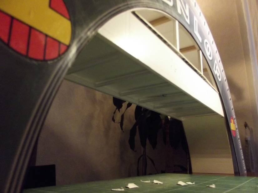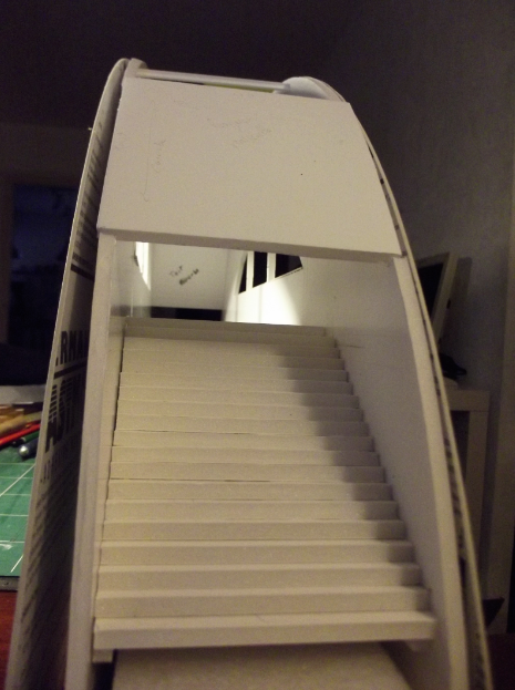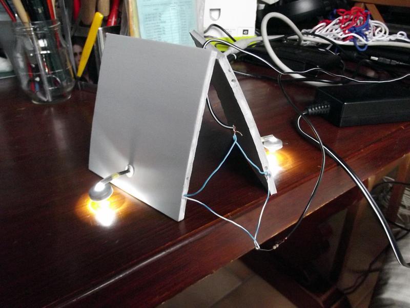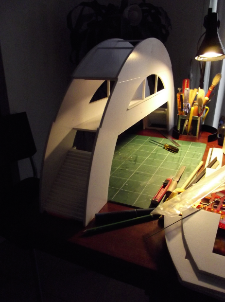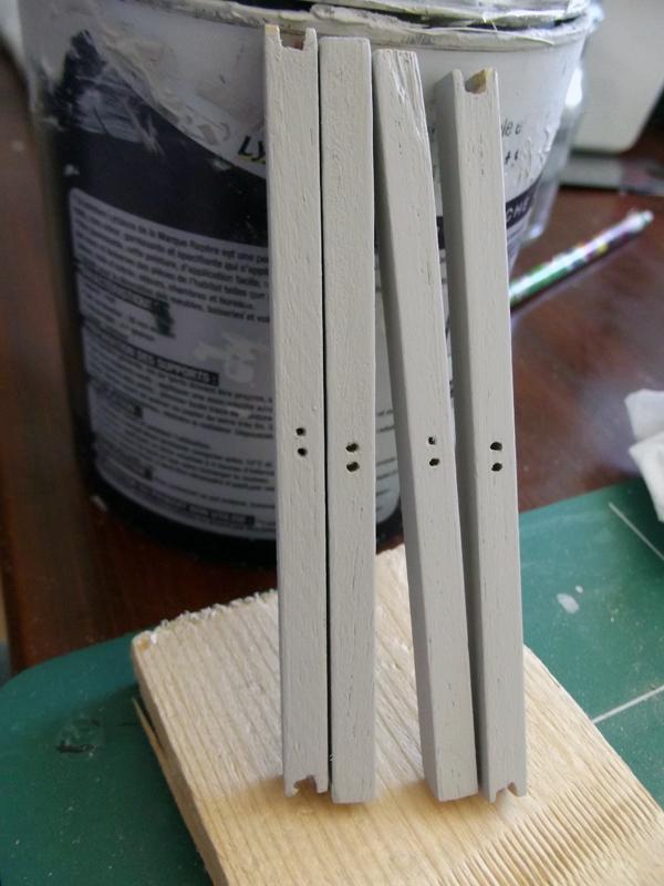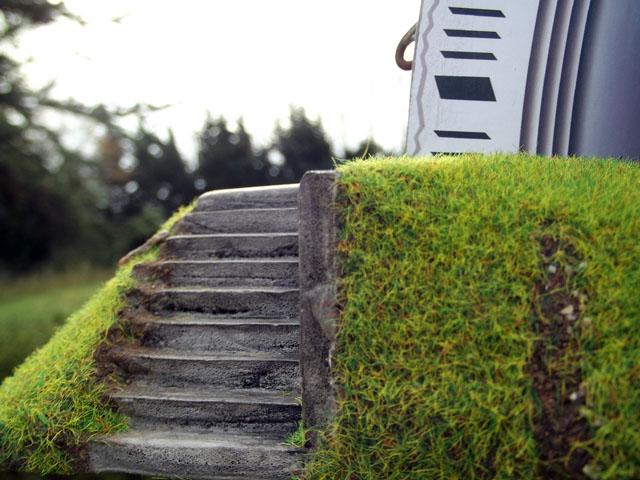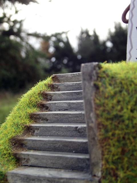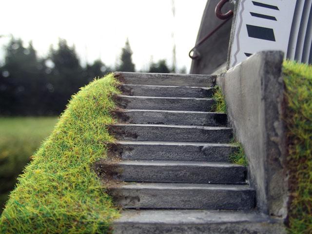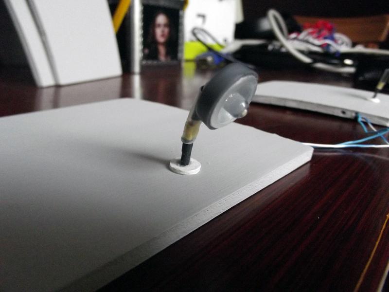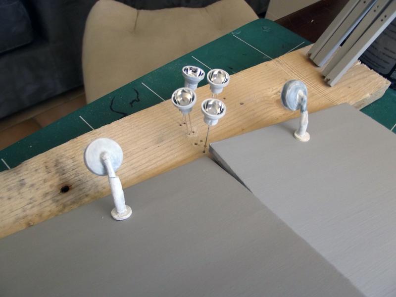 J'ai continué la passerelle ces deux derniers dimanches, j'ai terminé l'application des deux couches de peinture "béton". Mais aujourd'hui, je ne ai pas continué la peinture, car j'ai eu une idée pour l'éclairage extérieur. J'ai donc intégré deux lampadaires pour éclairer les deux zones d'herbe (un par zone).