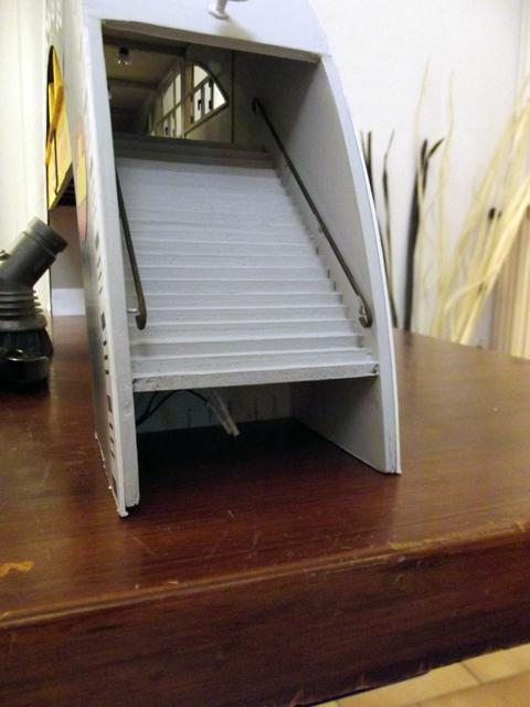 La passerelle assemblée et fonctionnelle. Elle est prête à recevoir les plateformes extérieur et sa patine de vieillissement.