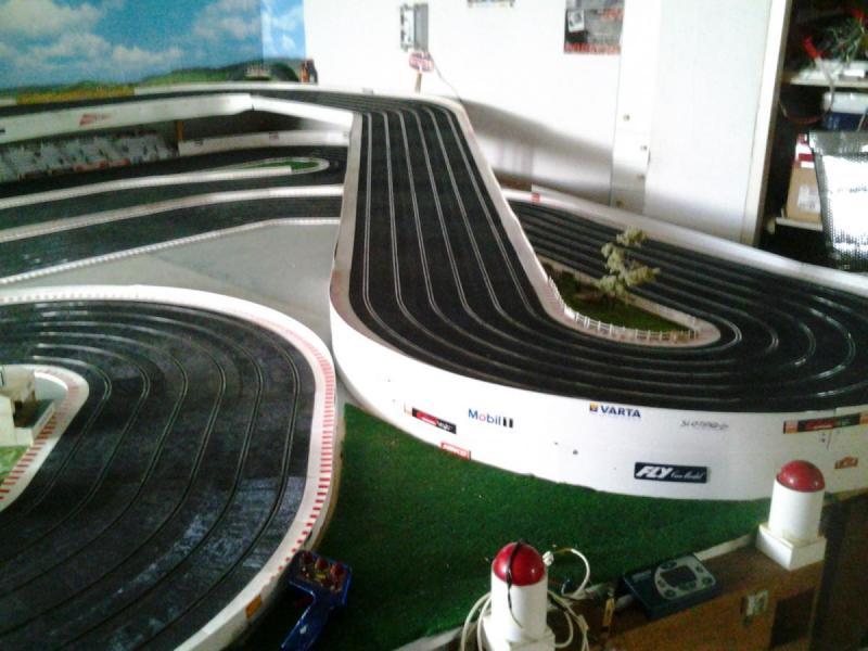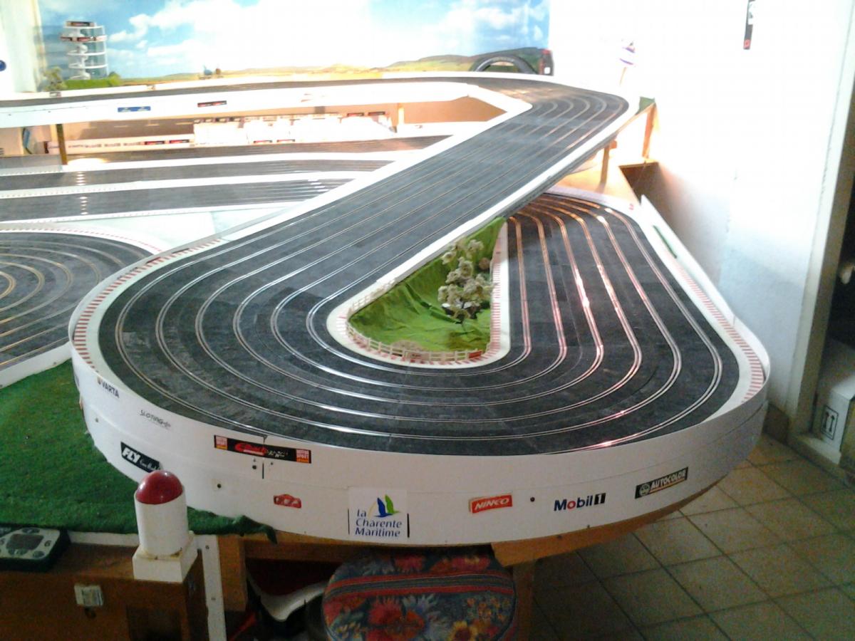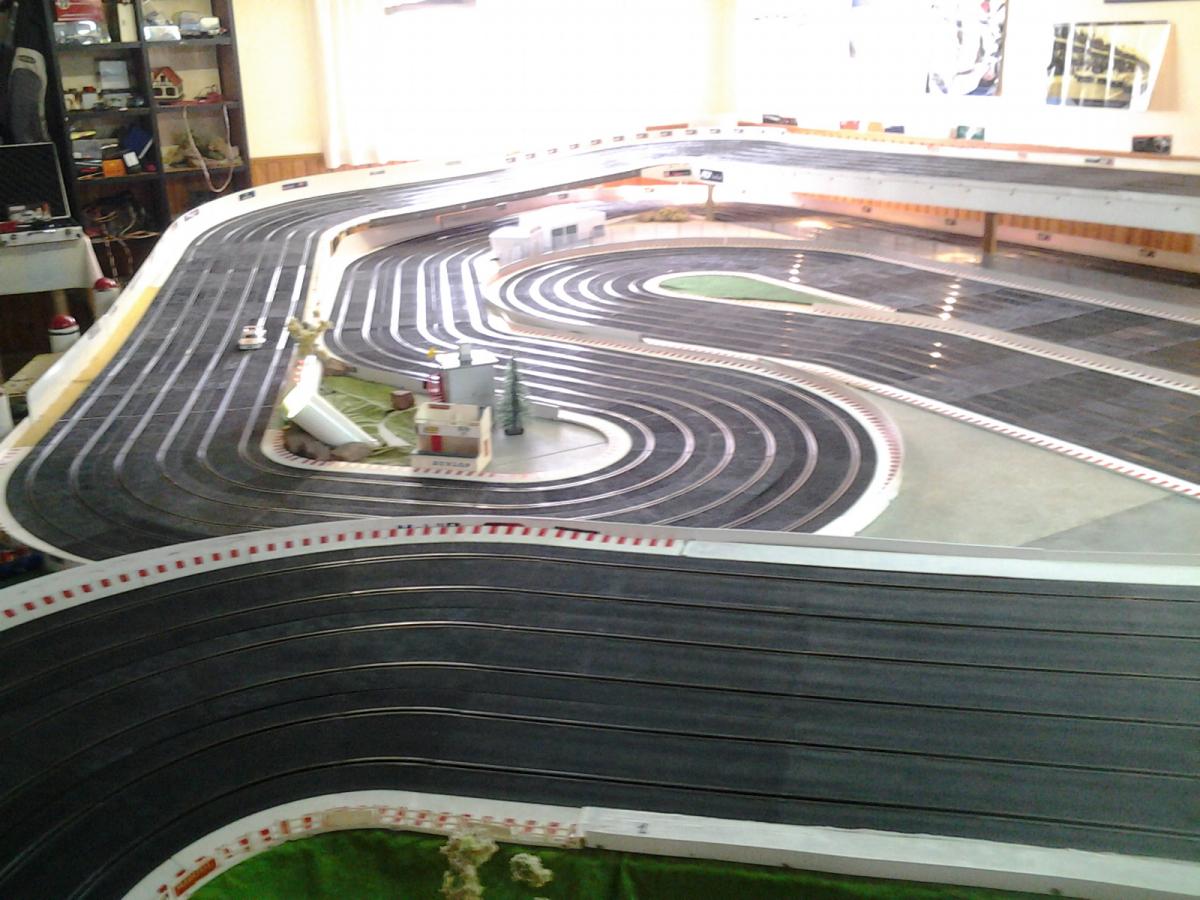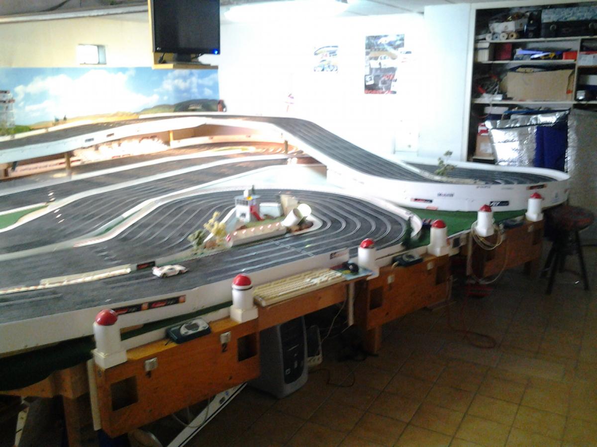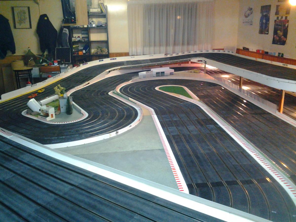 Piste Ninco 6 voies de 43 m et des poussières, 6 alimentations par piste, 6 transfo 15 v 4 A ,et pleins de voitures. Pour le reste et d'autres photos , on verra plus tard !!