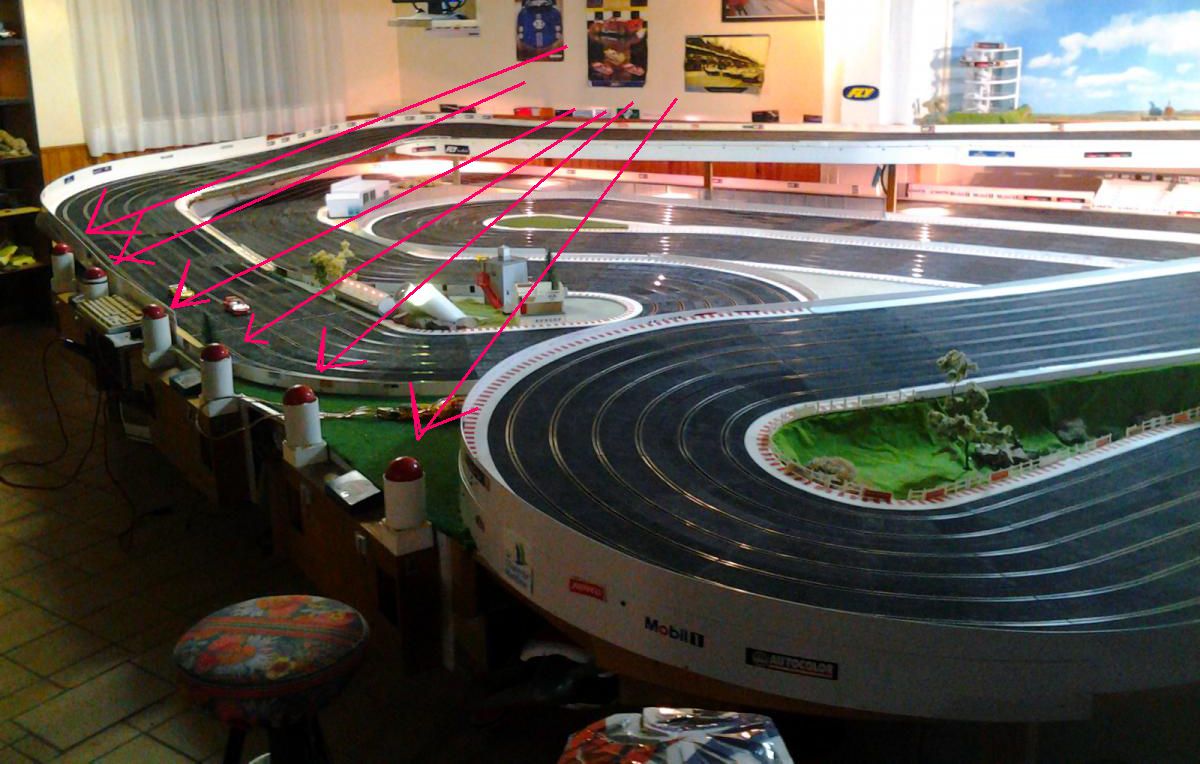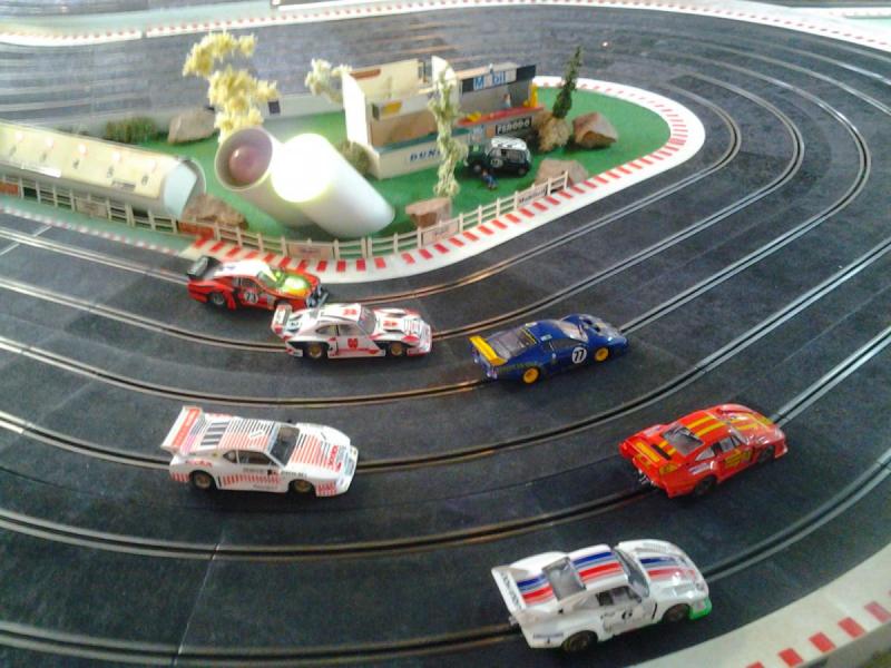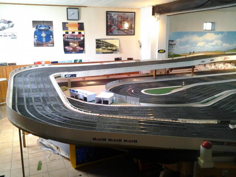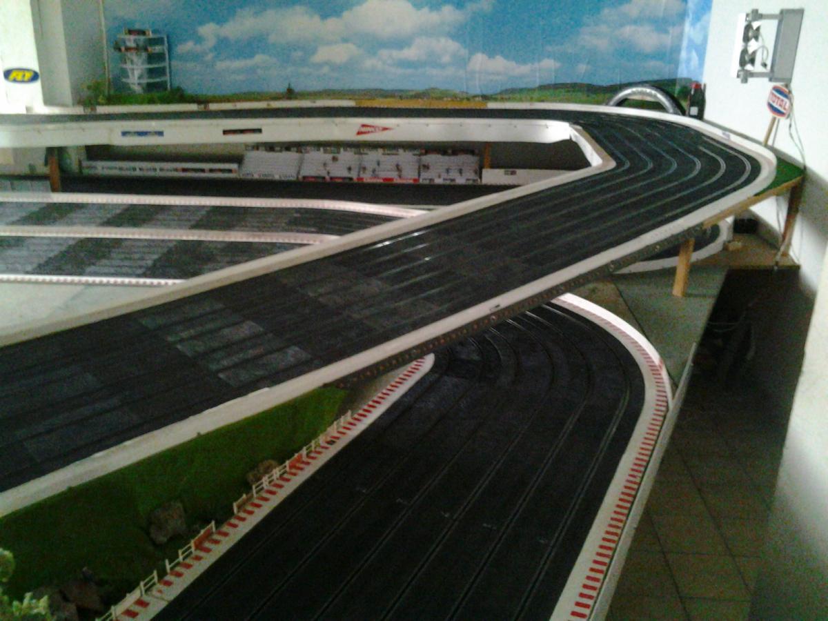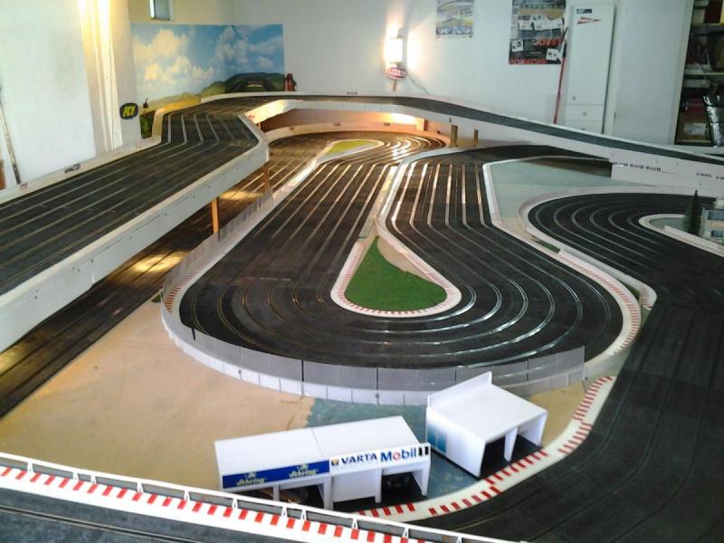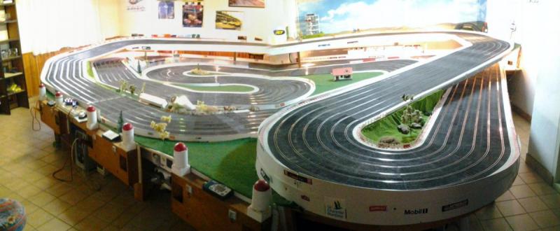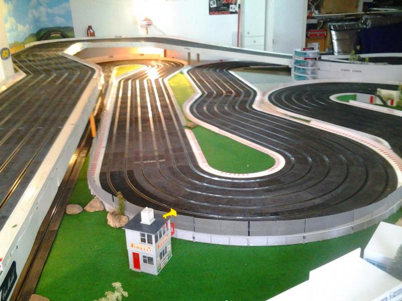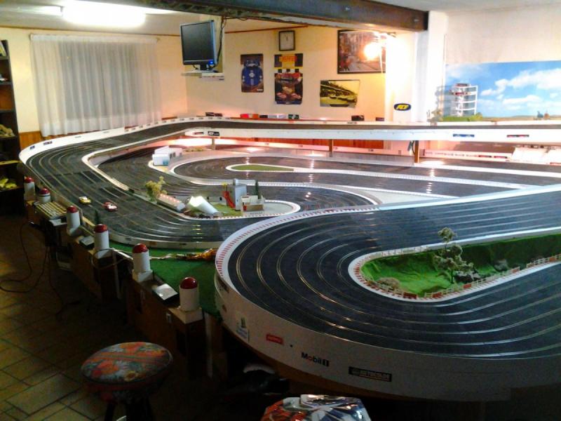 Piste Ninco 6 voies de 43 m et des poussières, 6 alimentations par piste, 6 transfo 15 v 4 A ,et pleins de voitures. Pour le reste et d'autres photos , on verra plus tard !!