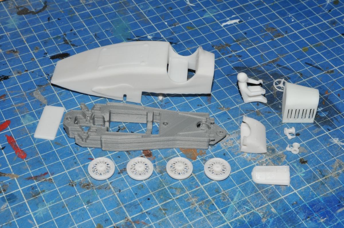 Après une modélisation en 3D pour concevoir une voiture en deux parties : un châssis imprimé en ABS recevant la motorisation, le guide et les essieux et un ensemble carrosserie/capot imprimé en résine :