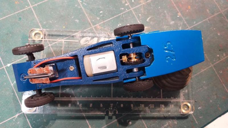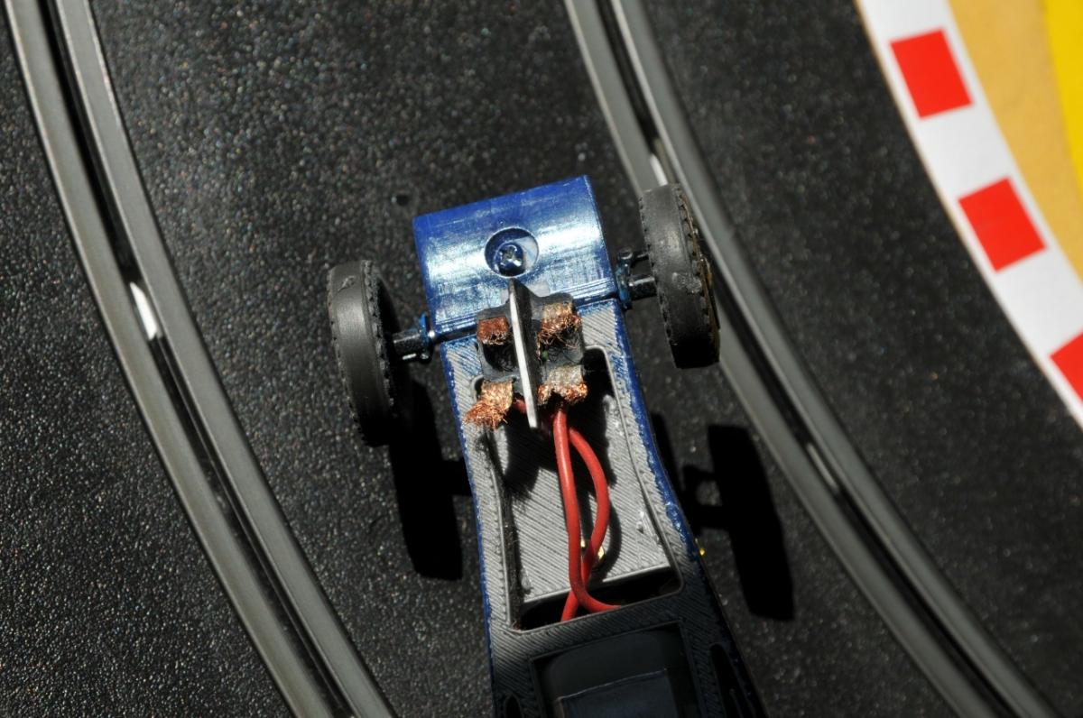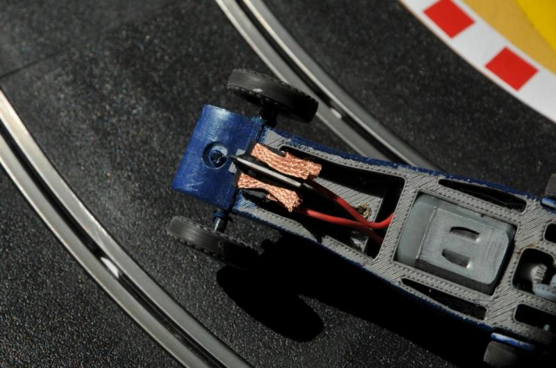 Tout le reste est connu ! Axe, couronne 27 dents et pignons 9 dents Slot It, un petit stoppeur Policar, des pneus repro Scalextric (écriture Dunlop sur l'intérieur afin de ne pas la voir) un moteur type NC1 et un pilote LMM.
