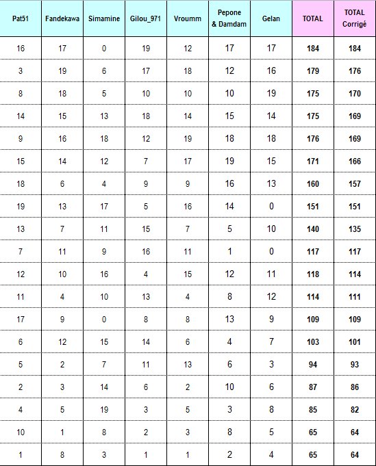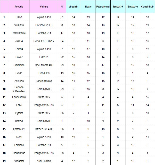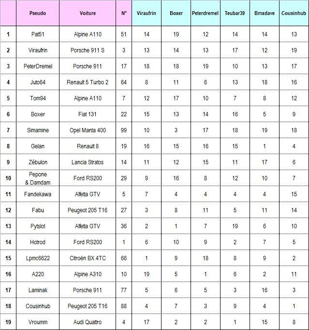 Félicitations à cousinhub et Tom94 pour leur beau podium. La 205 OSC était intouchable mais il y a eu une belle bagarre derrière à 3 pour deux places. Forcément l'un des trois, en l'occurrence Fabu, n'a pas pu trouver place sur le podium mais ça a été chaud jusqu'au bout.