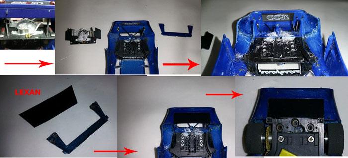 Pour la Ferrari: il est autorisé de supprimer le bloc plastique arrière et de poncer les ailes. Exemple de montage :