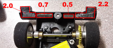 Pour la BMW : 5,4g de lest à l’arrière du châssis