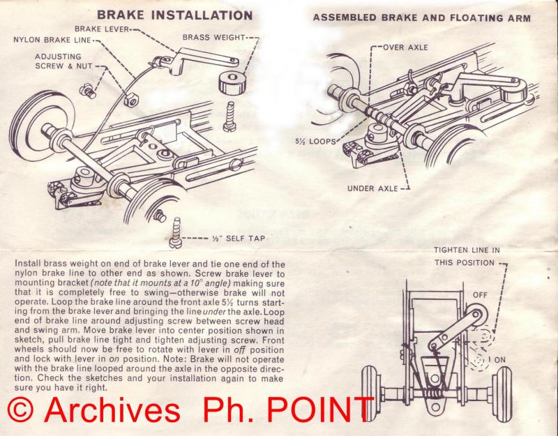 Ces châssis MPC avaient une grosse particularité, un frein mécanique sur l'axe avant. Ce n'était pas la seule marque à en avoir (Cox, K&B) mais malheureusement ces freins pas très efficaces ont la plupart du temps été démontés et les pièces sont manquantes.