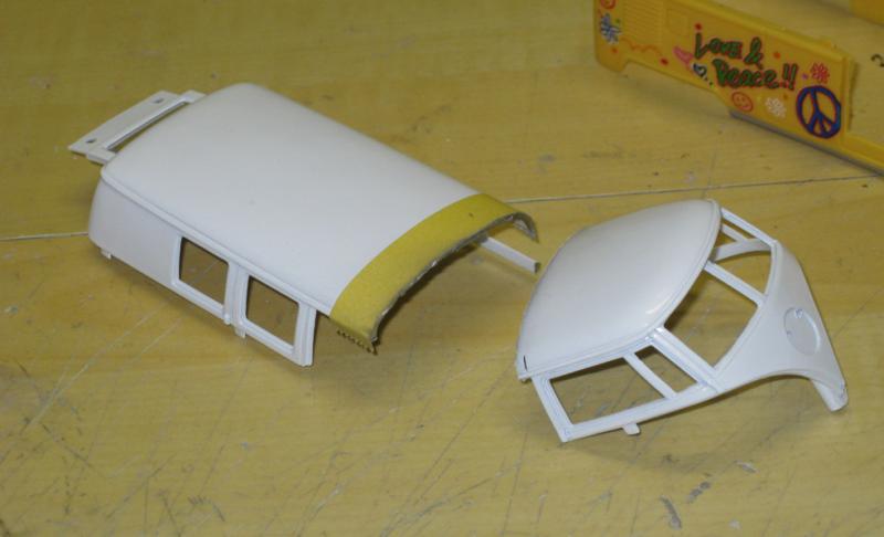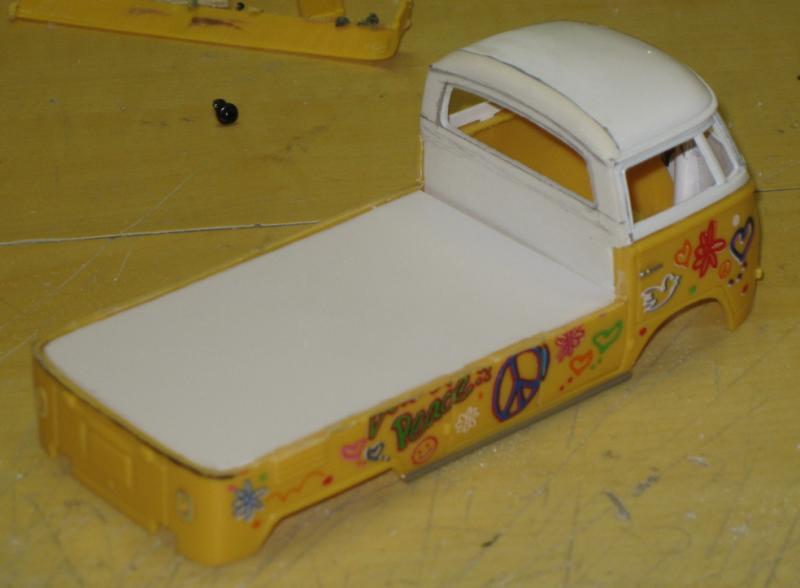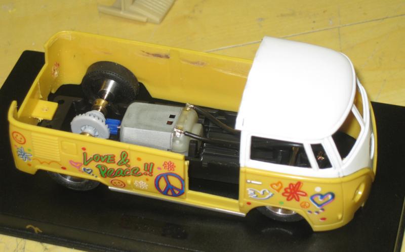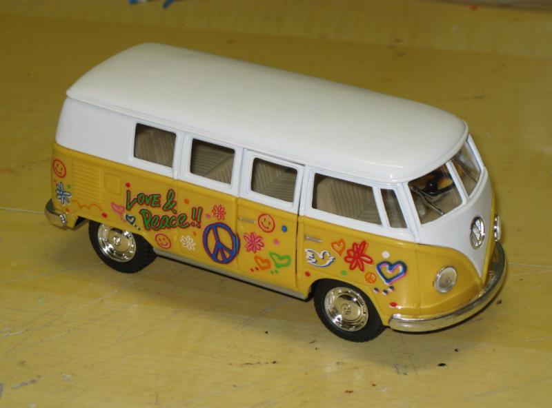 il existe depuis peu un joli petit combi au 32eme, avec une déco très gaie et insouciante. on peut se procurer cette miniature pour quelques euros sur la baie , elle est composée d'une carrosserie en deux parties: l'une métallique et l'autre en plastique. son poids n'est pas très élevé, mais cela ne va pas nous empêcher de lui faire subir un petit régime.