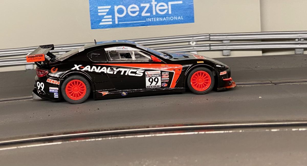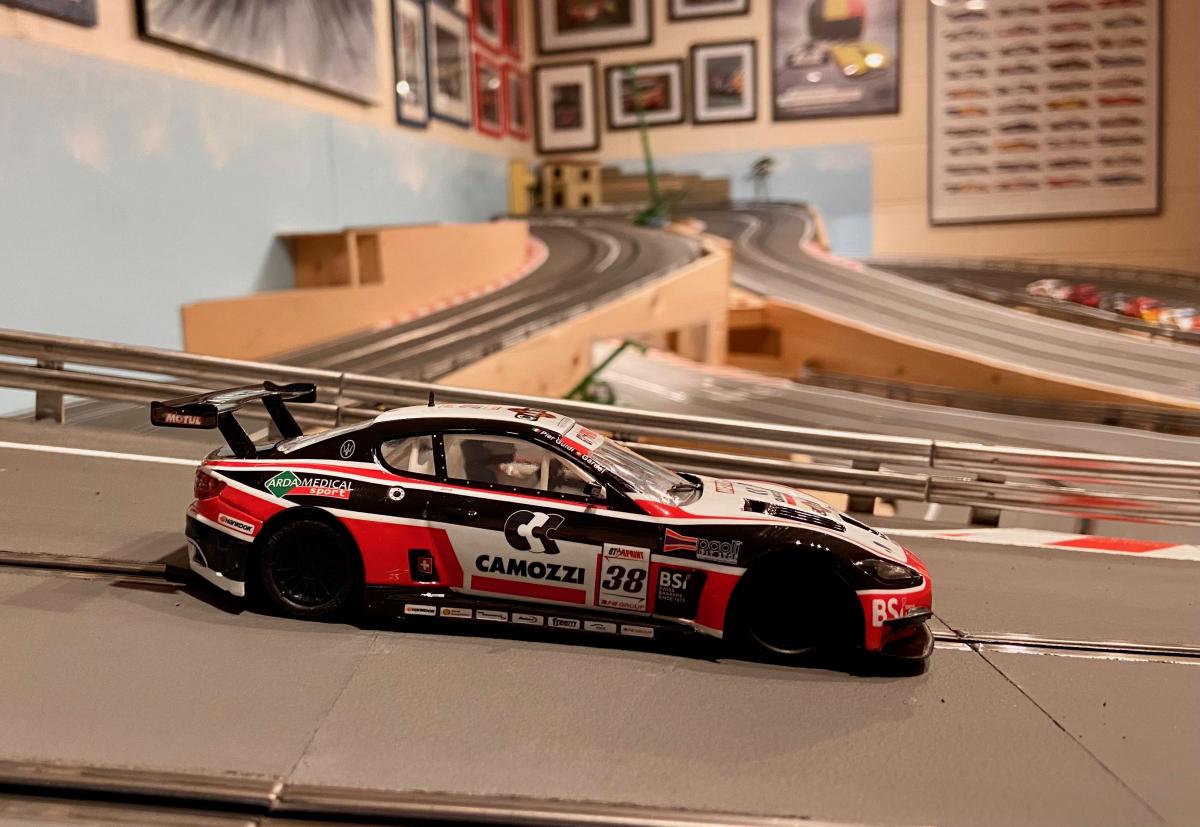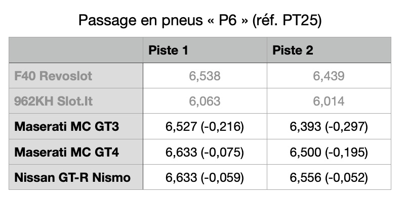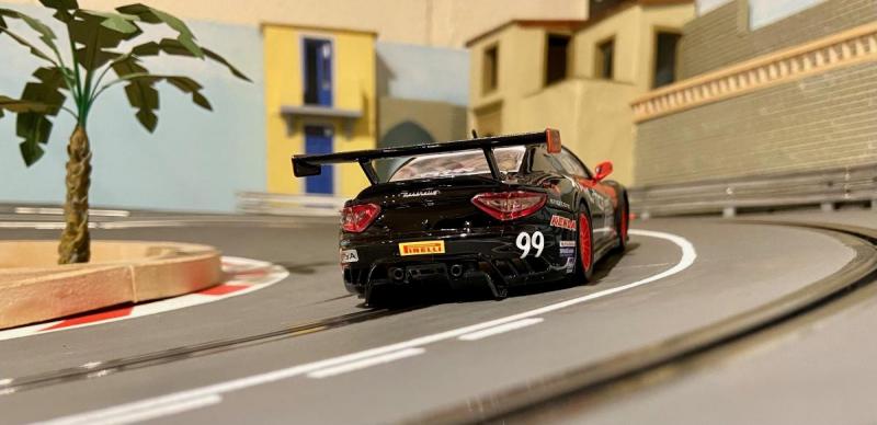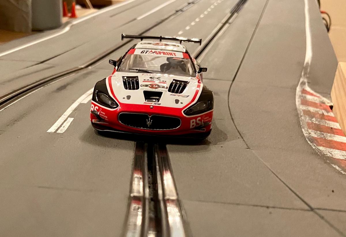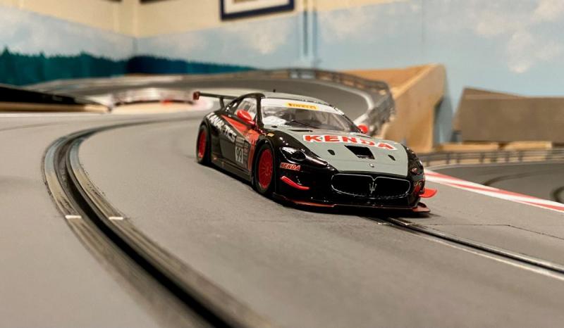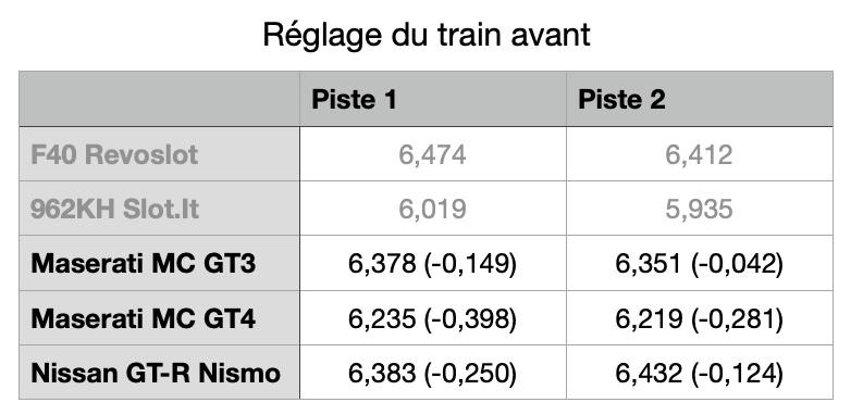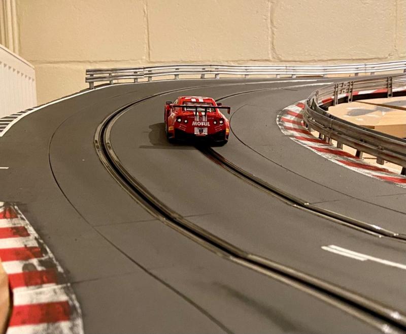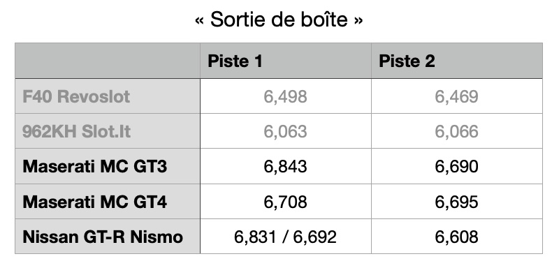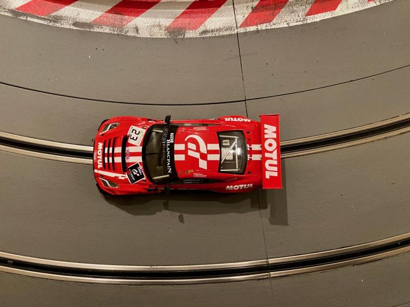 2) Je fais précéder le roulage des GT3/GT4 par un run avec mes voitures de test, à savoir une F40 RevoSlot (équipée en gommes G25) et une Porsche 962KH Slot.It (équipée en gommes P6). Ceci me permet de vérifier comment se comportent les voitures de test par rapport à leurs temps de référence.