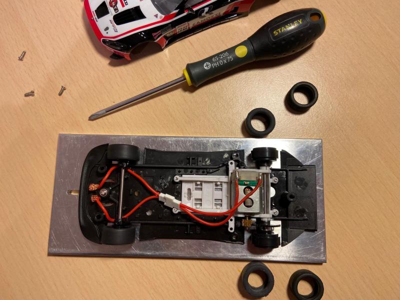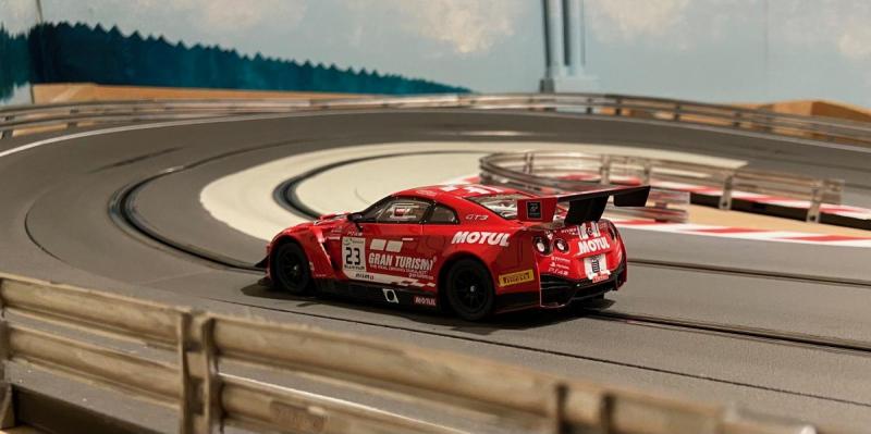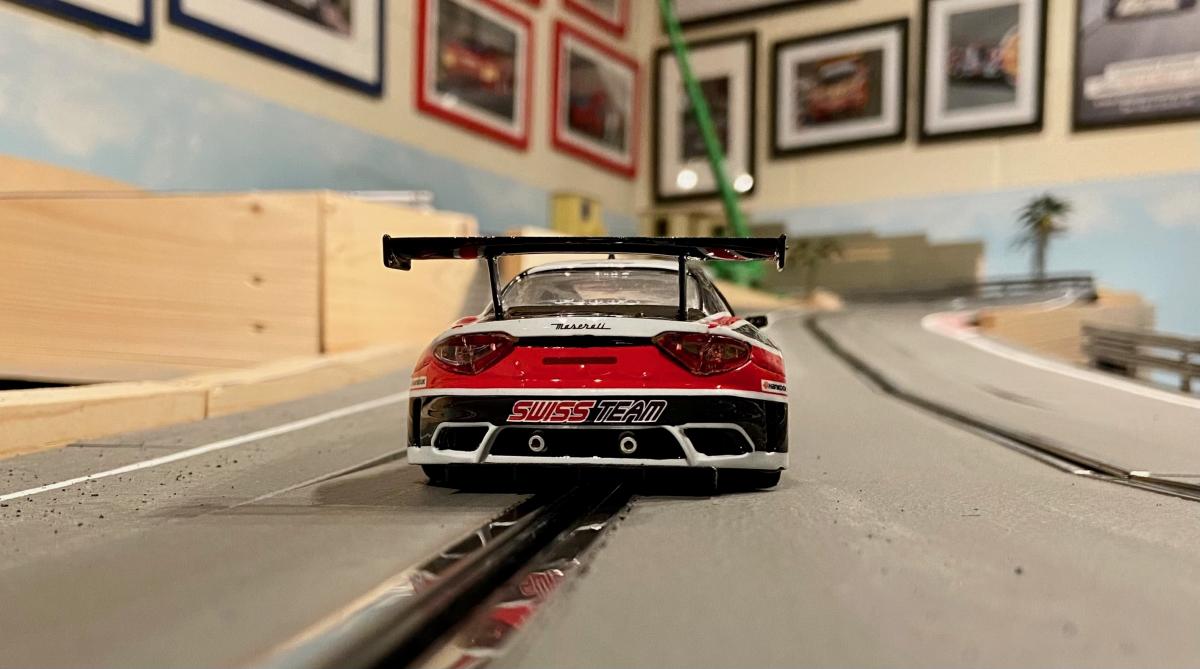 Vient le tour de la Nissan. Un pneu a été mal monté et la voiture sautille. Je corrige cela facilement et rapidement. La voiture glisse beaucoup moins que les Maserati, mais son comportement continue de me questionner et un premier run se termine en 6,831s sur piste 1. Je démonte la voiture et après examen attentif je me rends compte que le châssis est tordu