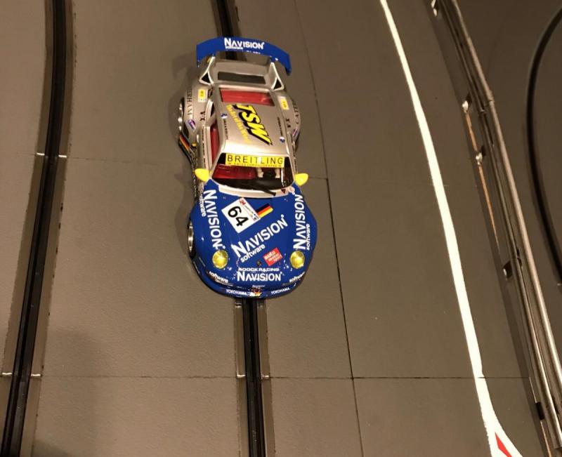 Il est temps de faire rouler cette Porsche 911 GT2 en configuration d'origine. Le run se déroule bien, et la sensation typique des séances de pilotage avec les RevoSlot se confirme, à savoir des débuts un peu déroutants et avec des pneus qui accrochent peu, avant que cela ne s'améliore franchement, donnant ensuite des temps d'une grande régularité, le meilleur d'entre eux étant 7,271 secondes.