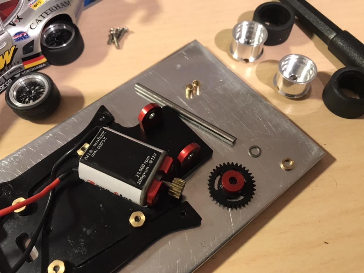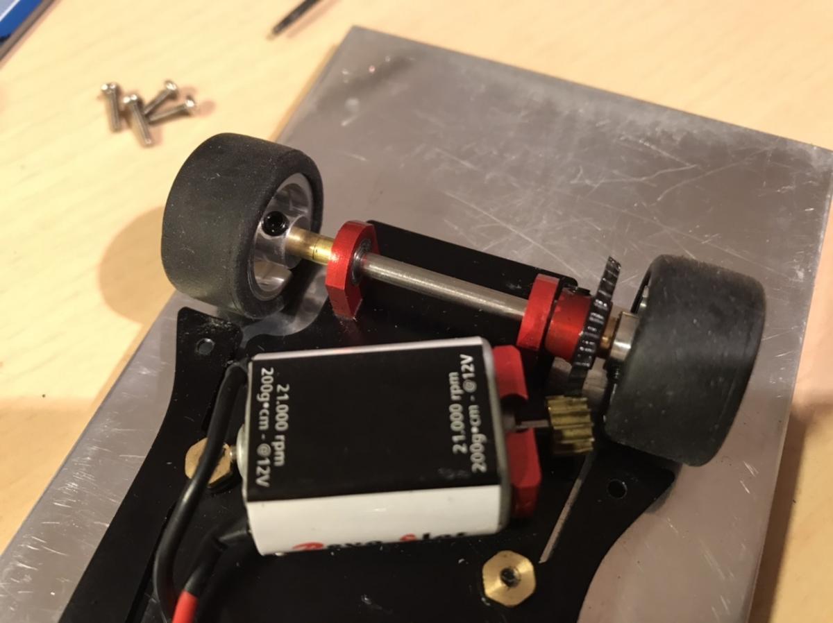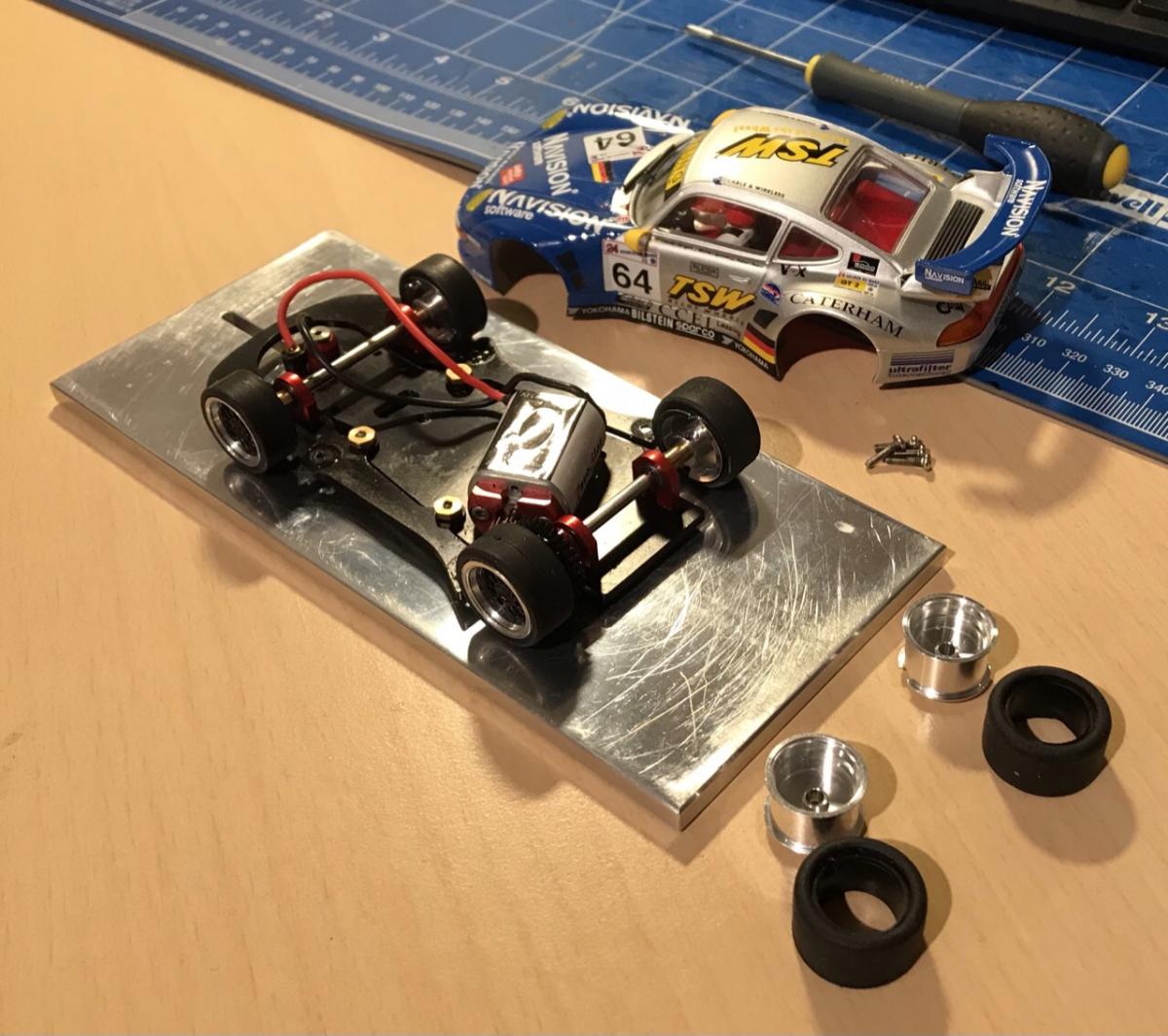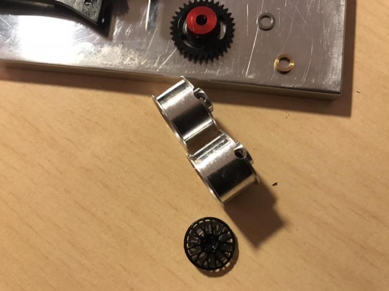 . enlèvement des fins spacers avant (2) et celui de l'arrière (1 côté couronne)+remplacement du long spacer par un plus petit (j'ai trouvé mon bonheur avec du Scaleauto 1/24 en plastique). Tout cela afin de réduire(légèrement la largeur des trains roulants) et que les les roues puissent "rentrer" dans les passages de roues.