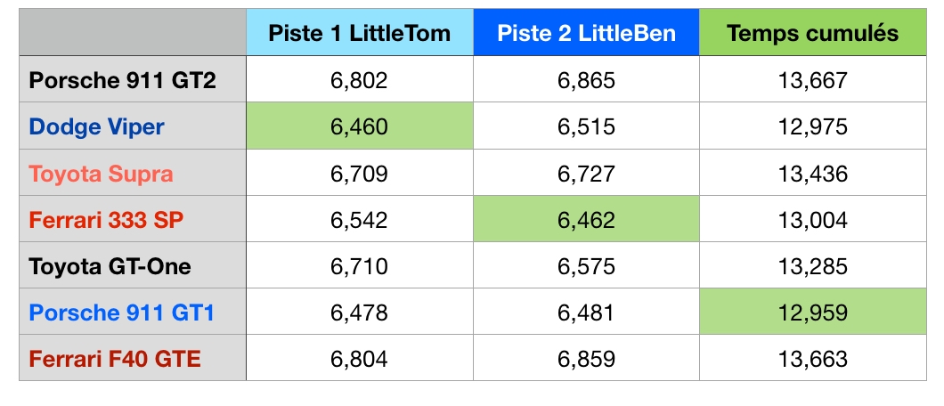 Trois Porsche GT2 avaient été utilisées et, si une devait avoir un souci car clairement pas terrible, les deux autres étaient à peu près dans les mêmes temps mais avec tout de même une différence suffisamment remarquable (du genre 1/2 tour sur 50). Par contre les deux étaient entre la Viper et la Supra.