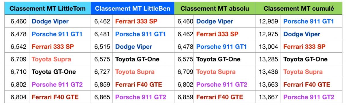 Il y a manifestement un groupe de trois voitures qui se détache du lot: la Viper, la Porsche 911 GT1 et la Ferrari 333 SP. Les écarts de performance selon les critères mentionnés plus haut sont très faibles. J'ai personnellement trouvé la 333 SP la plus agréable à piloter et à pousser dans ses retranchements, alors que Thomas a préféré la Viper. La 911 GT1 n'est en tête que d'un classement, celui des meilleurs temps cumulés. C'est peut-être elle la gagnante, finalement ...