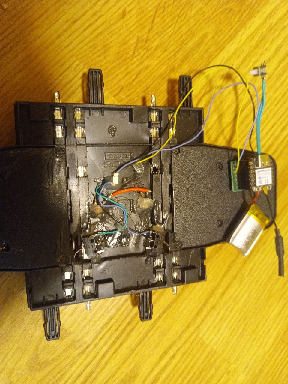 Au bout des contacteur, il y a un support pour une XIAO SEED ESP32-C3 avec un petit Buzzer. La XIAO SEED est sur une petite batterie. Elle se connecte à mon wifi domestique pour mettre à dispo une page web (sa aurait pu être un wifi autonome, mais sa aurait forcé a s'y connecter à chaque sessions).
