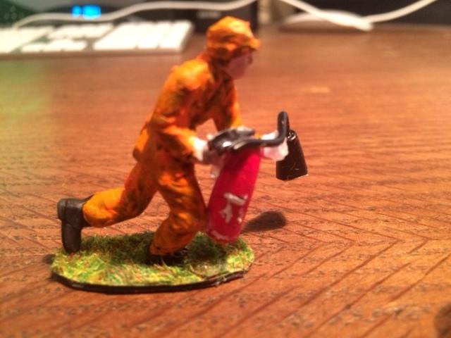 Toujours fait sur la base de petits soldats plastiques démilitarisés et repeints. L'extincteur c'est de la pâte Fimo, et pour la lance c'est juste fait à base d'un vieil écouteur... Ce qui est top avec le slot c'est que ça me permet de recycler tout un tas de vieux trucs! En fait le slot c'est Eco-responsable!