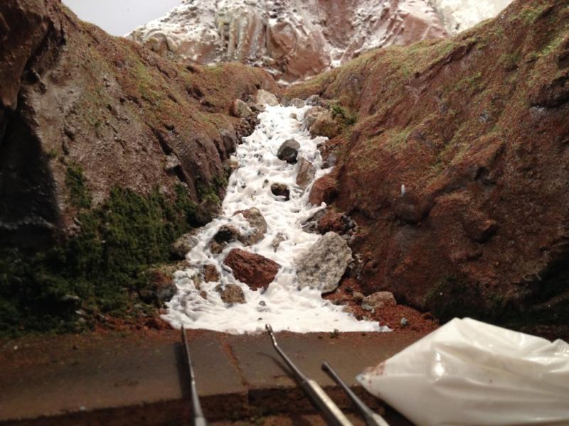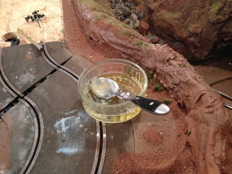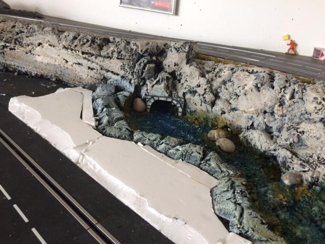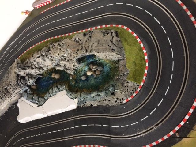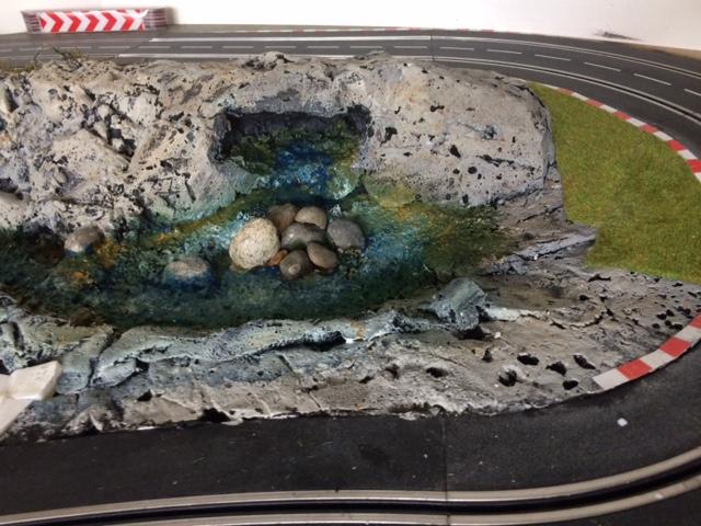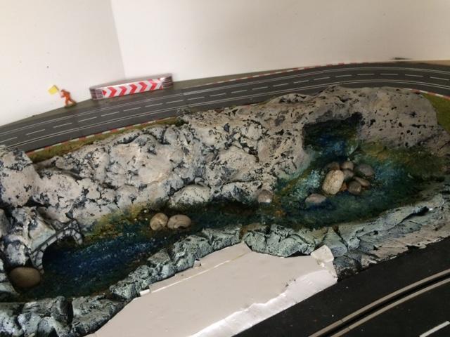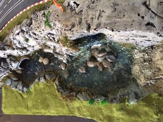 Merci à tous pour vos compliments ça encourage à faire encore mieux! Bon ce matin j'ai posé la pelouse du virage de la source et j'ai tenté de couler le liquide qui est censé représenter l'eau.