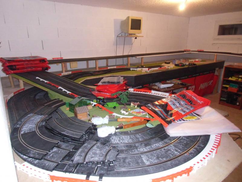 apres une longue absence, je reviens sur le forum, avec en projet pour ma slot room , de passer mon 4 voies de 15m a 22 m , j'ai déja fait la place, donc le projet ne va pas tarder a prendre tournure, j' ai également prévu de remettre 2 alim supplémentaires pour avoir une alim réglable par voie au lieu d'une pour 2 pistes . Surélévation de ma ligne droite pour donner du volume a a la piste, meme si j'ai pas de déco dans l'immédiat . Achat de bordures ninco pour tout le circuit logiquement . Je vous remet des photos un peu plus tard de l'avancement des travaux .