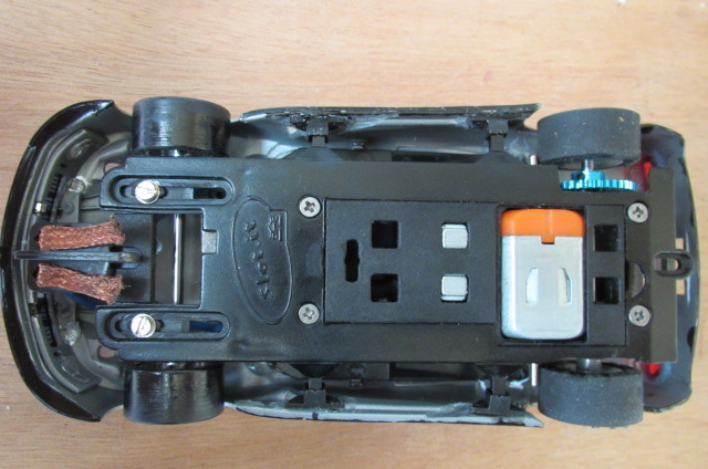 J'ai viré tout l'éclairage (y compris les néons bleus) et j'ai posé le tout sur un châssis Slot-It, moteur et transmission Slot-It, avec jantes et pneus NSR (vernis à l'avant), un peu de plomb au centre et en arrière du guide (l'aimant sert seulement de lest, puisque je roule sur bois uniquement):