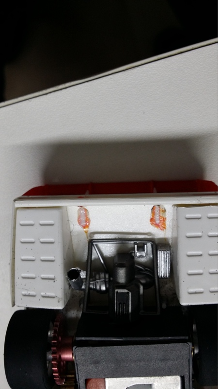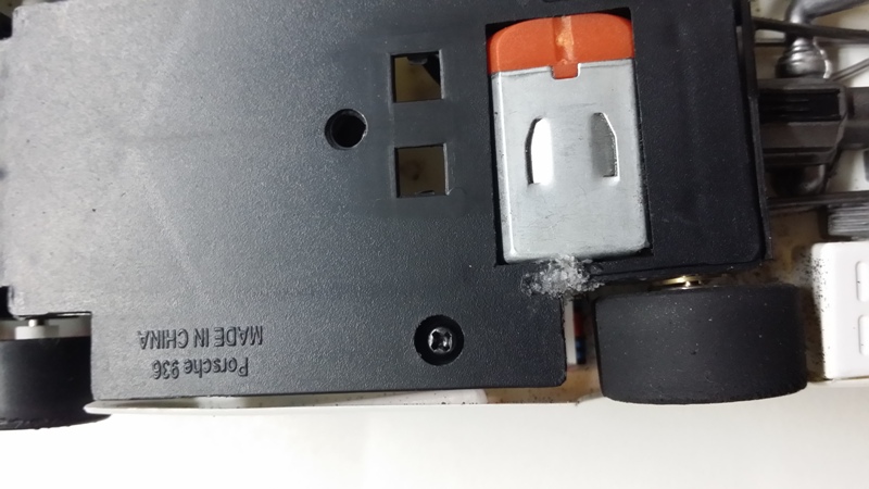 Comme elle est censée participer au championnat du club dans la catégorie proto 1970, avec moteur imposé en slot-it cage orange, je décide de changer le moteur. J'essaye de soulever doucement le moteur pour le sortir de son logement et premier gros problème le châssis casse. C'est une habitude pour moi avec les Spirit.