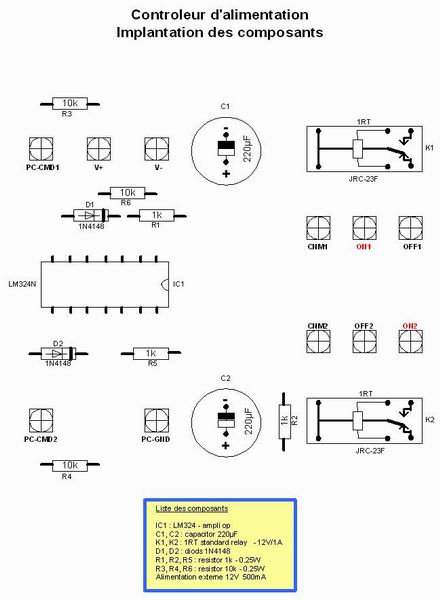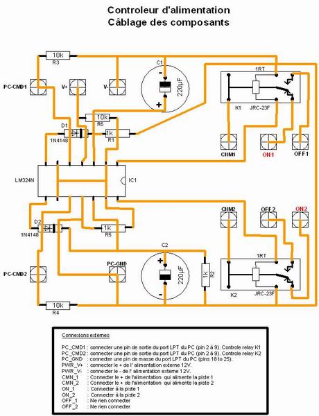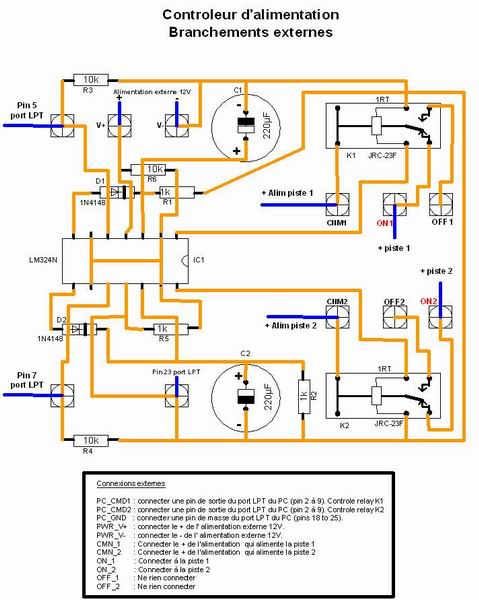 C’est la que l’on va connecter les alimentations des pistes. Personnellement, j’utilise 2 alimentations variables stabilisées. Une alimentation pour la piste 1 et une autre alimentation pour la piste 2. En passant par le contrôleur d’alimentation le relais K1 gèrera l’alimentation de la piste 1 et le relais K2 l’alimentation de la piste 2.